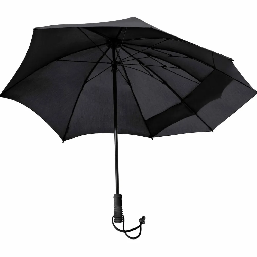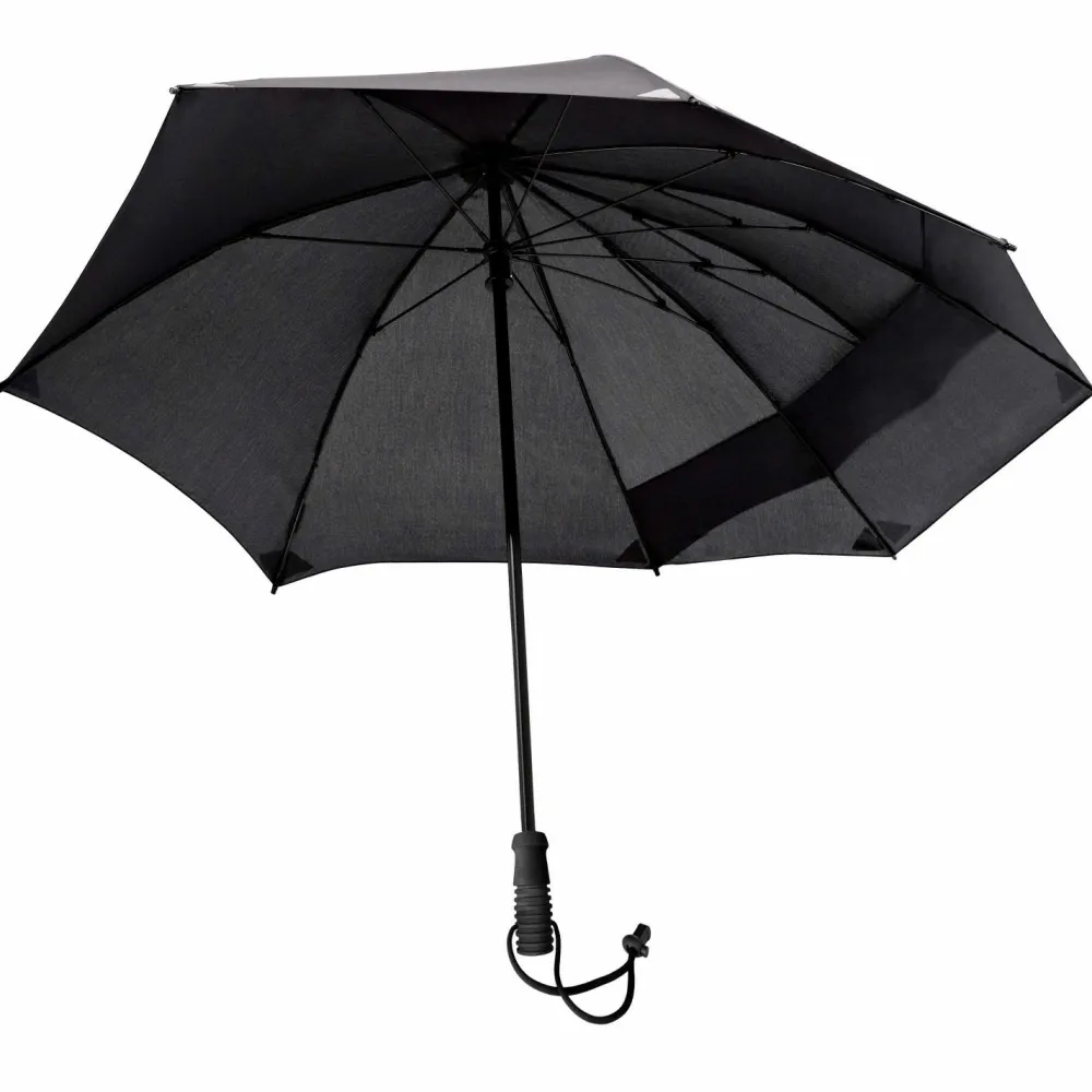 Mit dem Swing Backpack Handsfree von Euroschirm bleiben die Hände beim Wandern frei! Besonderer Clou des Spezialschirms ist sein Telescop-Fiberglas-Schaft, der sich stufenlos ausziehen lässt und mit einer kleinen Drehbewegung in jeder Höhen-Position fixiert werden kann. An zwei mitgelieferten drehbaren Halteclips, die mit einem Nylon-Klettband vorne an den beiden Tragegurten des Rucksacks befestigt werden, lässt sich der Schirm je nach Windrichtung links oder rechts positionieren. Die am Schirmgriff fixierte Trageschlaufe dient als flexible Fixierung am Hüftgurt. Der 366 Gramm leichte Schirm lässt sich darüber hinaus auch als ganz normaler Wanderschirm einsetzen. Größtmöglicher Tragekomfort bietet dafür ein angenehm samtiger Griff aus handsympathischem High-Density-Hartschaum. Mit einem Durchmesser von 114 cm ist er in jedem Fall groß genug, um Wanderer und Rucksack gleichermaßen gut und zuverlässig vor Regen zu schützen.