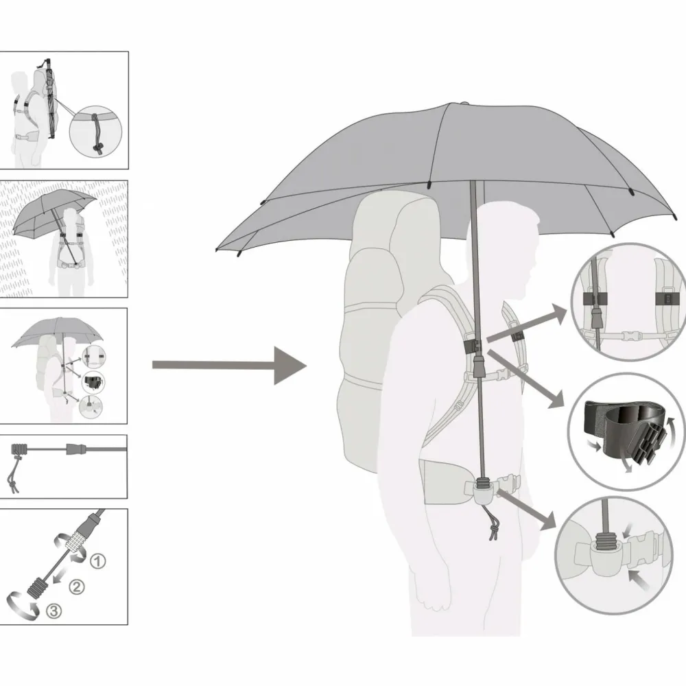 Im Lieferumfang enthalten sind darüber hinaus auch zwei Gummi-Bänder mit Fixiervorrichtung – damit lässt sich der Schirm bei Nichtgebrauch an allen Rucksäcken seitlich im geschlossenen Zustand fixieren.