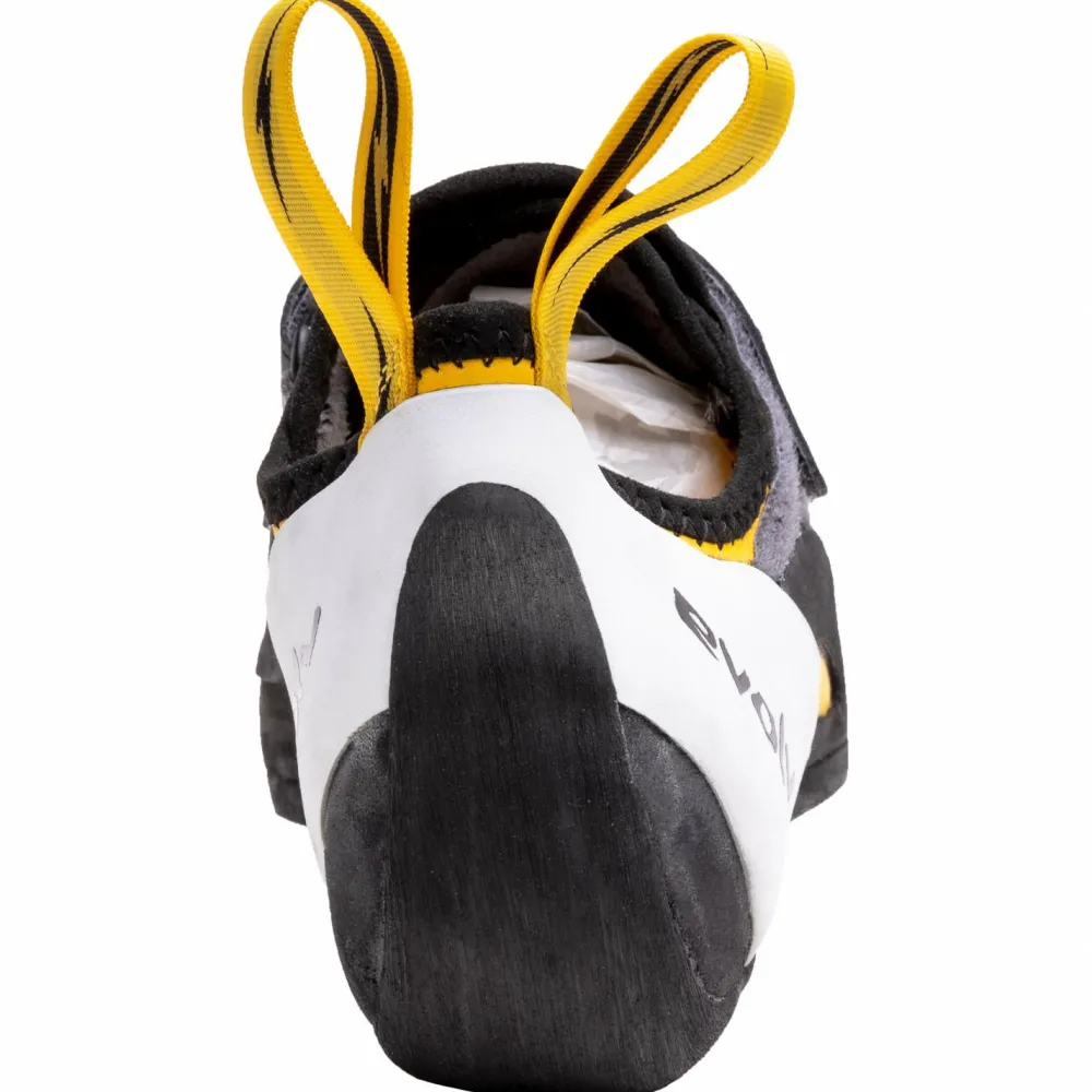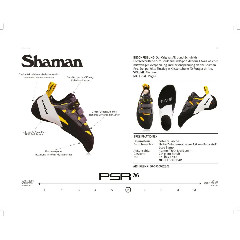 Die Kletterschuhe Shaman von Evolv sind genau richtig zum Bouldern und Sportklettern in steilstem Gelände. Durch die starke Vorspannung, den stark asymmetrischen Leisten und den Downturn (=konkave Vorspannung der Schuhsohle im Vorderfußbereich zur Erhöhung des Anpressdruckes der Zehenspitzen) lässt sich mit den Kletterschuhen auch auf kleinen Leisten gut stehen. Der Effekt wird durch den ‚Love Bump‘, eine Wölbung unter den Zehen, noch verstärkt – außerdem entsteht dadurch kein leerer Raum unter den Zehen.