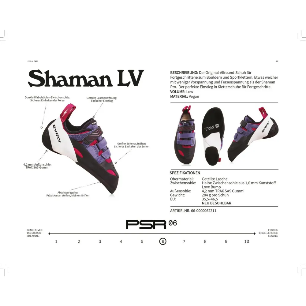 Für alle, die beim Klettern auf maximale Kraftübertragung setzen, sind die Shaman LV Kletterschuhe von Evolv genau das richtige. In der Vertikale und im Überhang kannst Du mit diesen Schuhen alle Trittarten meistern. Präzise Fußarbeit wird mit den Shaman LV zu einer Leichtigkeit. Zudem haben sie die perfekte Kombination aus tollem Tragekomfort und effektiver Spannung. Die Kletterschuhe sind nämlich durch den Hohlraum oberhalb der Zehen super bequem und die effektive Spannung lässt dank der Kunststoff-Zwischensohle auch mit der Zeit nicht nach. Das macht die Shaman LV Kletterschuhe besonders langlebig.