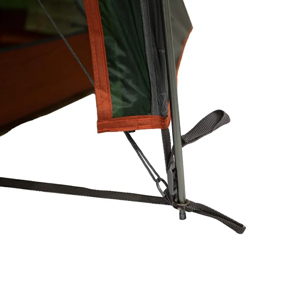 Die Abspannleinen sind aus dem besonders reißfesten Dyneema Gewebe hergestellt. Dank einer reflektierende Beschichtung sind die Leinen beim nächtlichen Toilettengang optimal sichtbar. Alle verwendeten Materialien am Ultraleichtzelt sind flammhemmend. Beim Außenzelt kommt ProTex 15 SRN Gewebe zum Einsatz. Das wind- und wasserdichte Material ist dank einer Beschichtung mit Silikon und Polyurethan gegen Durchfeuchtung geschützt und lässt den Regen an der Oberfläche abperlen.