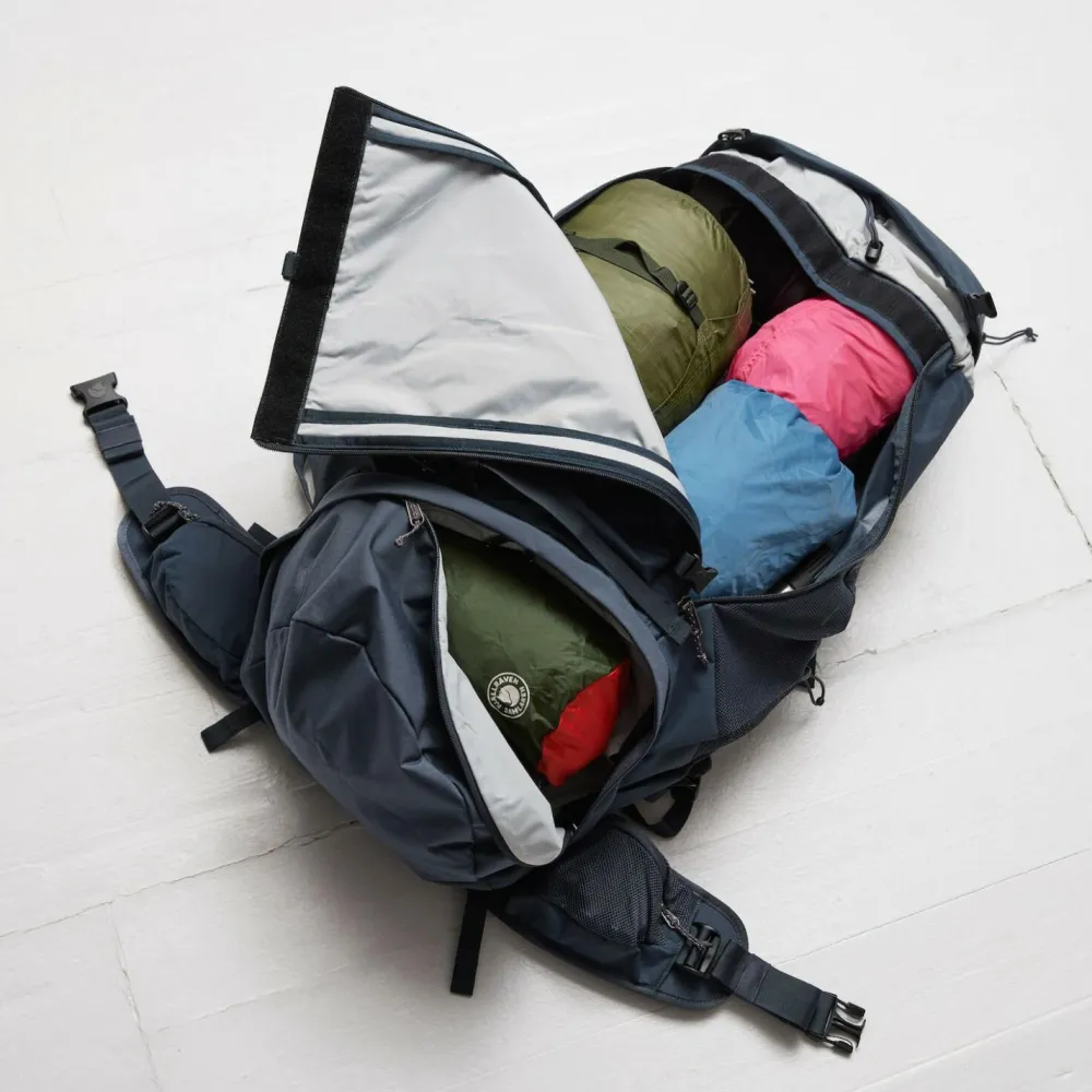 So macht Reisen Spaß – mit dem Abisko Trek 65 von Fjällräven. Mit 65 Litern Fassungsvermögen bietet der Rucksack viel Stauraum für alles, was Du auf Deiner Tour benötigst. Zugriff auf das große Hauptfach hast Du von oben und dank seitlicher Reißverschlüsse kannst Du den Frontbereich komplett öffnen. Kleineres Gepäck lässt sich in verschiedenen kleineren Reißverschlusstaschen am Deckel und Hüftgurt oder auch an Befestigungsschlaufen und Gummizug an der Außenseite unterbringen.