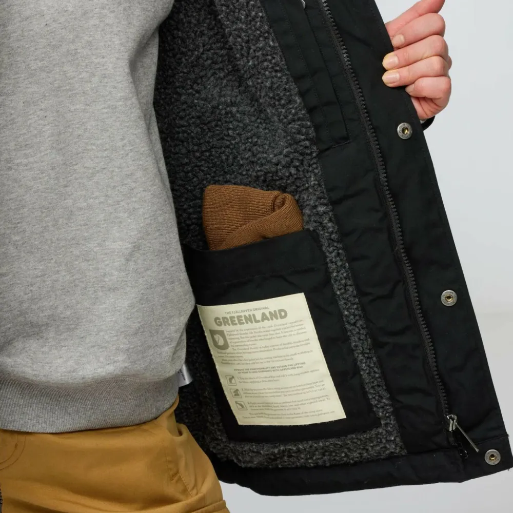 Die Greenland Winter Jacket ist mit einem hohen Kragen und einer warm gefütterten Kapuze versehen. Dadurch sind auch Hals- und Kopfbereich bestens vor Wind, Regen und Schnee geschützt. Die Winterversion der legendären Greenland Jacket wird mit einem durchgehenden Zwei-Wege-Reißverschluss geschlossen, der zusätzlich von einer breiten Abdeckleiste geschützt wird. Edle Druckknöpfe und die hochwertige G-1000 Textur geben der Greenland Winter Jacket den perfekten Winter-Style.