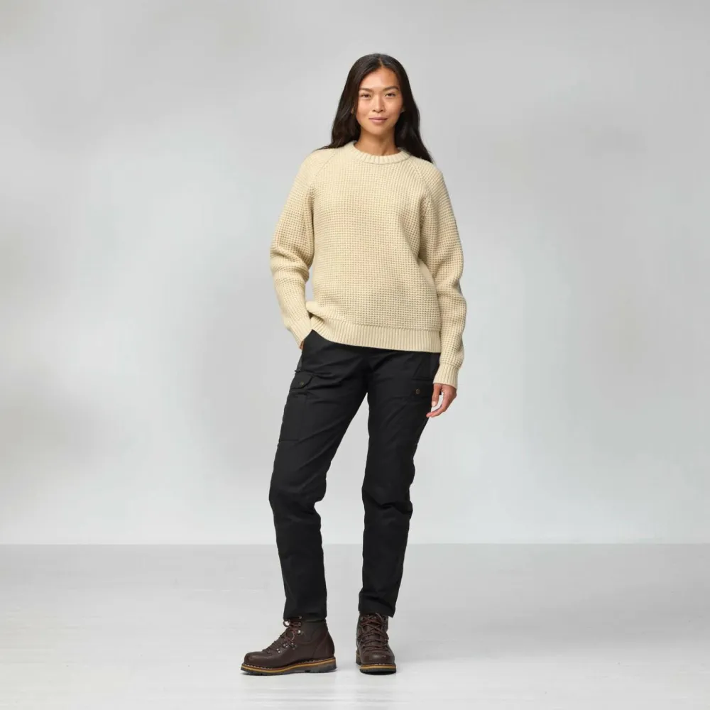 Der dicke Women’s Övik Waffle Knit Wollpullover von Fjällräven kann Dich auch an den kältesten Wintertagen wärmen. Du kannst ihn im Haus und im Büro tragen, er eignet sich aber auch als wärmende Außenschicht in den Übergangsjahreszeit. Er kann Dich beispielsweise auch bei der Gartenarbeit, beim Fischen oder beim Spaziergang mit dem Hund begleiten. Das Material aus Wolle ist von Natur aus leicht wasserabweisend und kann einem kurzen Regenschauer oder feuchtem Morgennebel gut standhalten. Außerdem ist Wolle dafür bekannt, auch in feuchtem Zustand eine gute Wärmeleistung zu haben.