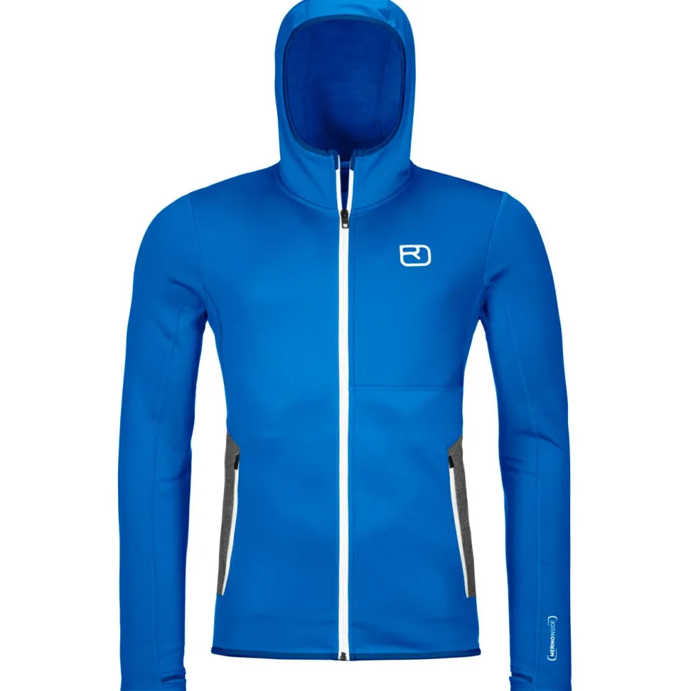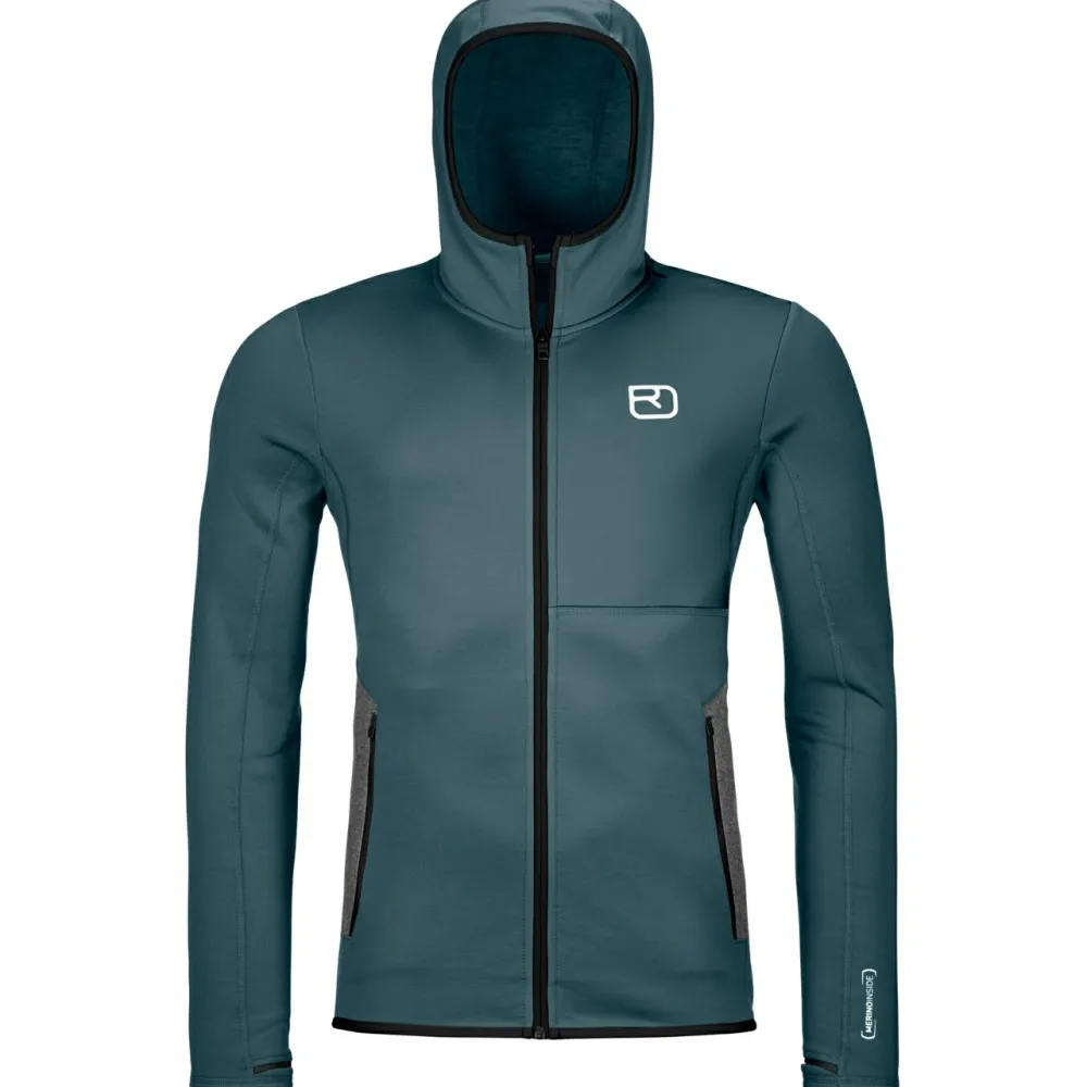 Die Outdoorjacke ist mit flexiblen Daumenschlaufen ausgestattet und besteht aus Merino Fleece von Ortovox. Bei diesem funktionalen Stoff wird recyceltes Polyester mit weicher Merinowolle aus tierfreundlicher Herstellung kombiniert. Das leichte Material ist atmungsaktiv, trocknet schnell und passt sich bei jeder Bewegung an den Oberkörper an. Die Wolle sorgt durch ihre Temperatur-regulierenden und geruchshemmenden Eigenschaften auf jeder Tour für hohen Tragekomfort.