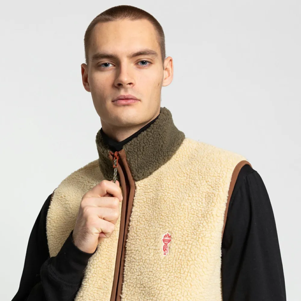 Die Fleeceweste hält die Körpermitte bei Kälte angenehm warm. Dank des hohen Kragens ist auch der Hals vor Zugluft geschützt. Der durchgehende Reißverschluss kann bei Bedarf zur Belüftung geöffnet werden. In den beiden unauffälligen Fronttaschen lässt sich Kleinkram schnell erreichbar verstauen. Eine kleine Fackel ziert die Brust und das coole Blockfarbenmuster macht die warme Weste zu einem echten Hingucker.