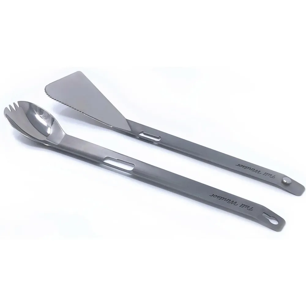 Der Splitter von FullWindsor ist ein Küchen-Multitool der mobilen Art! Das Set besteht eigentlich aus eine(r,m?) Gaffel (=Gabel + Löffel) und einem vielseitig einsetzbaren Spatel. Beides sinnvoll in der Outdoor-Küche, aber: man kann die Zwei auch an den oberen Enden zusammenstecken, und erhält so eine Koch- und Grillzange. Dank dem Super-Werkstoff Titan wiegt das Set fast nichts (22g), und für den Transport können die beiden separaten Teile an den Griffen aneinander befestigt werden, wodurch sie kaum Platz wegnehmen.