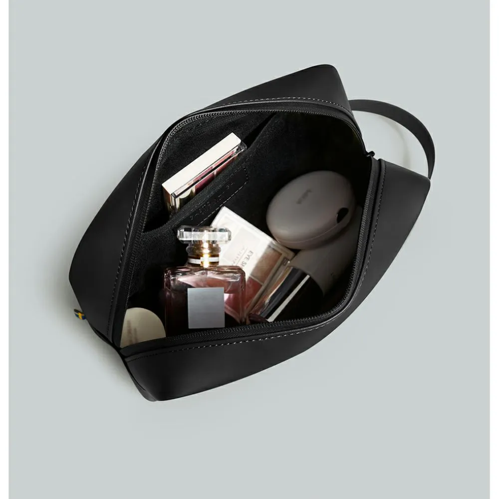 Der Spläsh Toiletry Bag von Gaston Luga ist ein ebenso kompakter wie eleganter Kulturbeutel. In seinem wasserdicht verschließbaren Innenraum mit seitlicher Eingrifftasche verstaut er alle Badezimmerutensilien sicher und übersichtlich. Falls doch einmal etwas auslaufen sollte, ist das dank des leicht zu reinigenden Materials kein Problem.