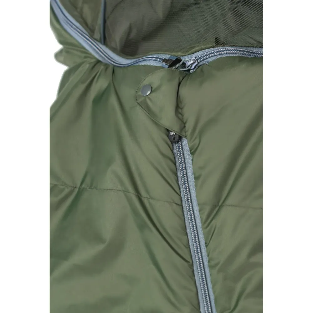 Damit lästige Stechmücken nicht stören, wurde ein 3D-Moskitonetz integriert. Das Netz wird durch drei kleine Rundbogenstangen über dem Kopf aufgespannt und schützt so vor den kleinen ungebetenen Gästen. Zum besseren Durchlüften befindet sich im Fußbereich ein weiteres Moskitonetz. Der Außenstoff ist besonders robust und widerstandsfähig und auf der Unterseite sind Anti-Rutsch-Noppen Streifen angebracht. Das verhindert ein lästiges Abrutschen von der Isomatte. Sehr praktisch ist auch das Kopfkisseneinschubfach, welches Deine Fleecejacke zum Kopfkissen umfunktionieren lässt. Der Schlafsack ist bis zu einer Körpergröße von 185 cm geeignet.