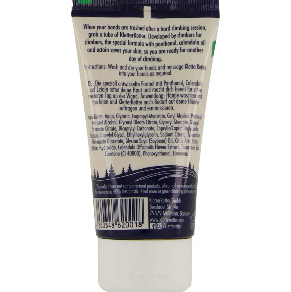 Zieht schnell ein und pflegt mit hochwertigen Inhaltsstoffen – die Handcreme von KletterRetter! Die Creme enthält Ringelblumenöl, welches für seine entzündungshemmende Wirkung bekannt ist. Zusammen mit Panthenol (Vitamin B5) wird so die Heilung von Wunden beschleunigt und die Haut erholt sich leichter von starken Belastungen. Außerdem spendet die Creme viel Feuchtigkeit für ausgetrocknete Haut – die beste Pflege für geschundene Kletterer-Hände!