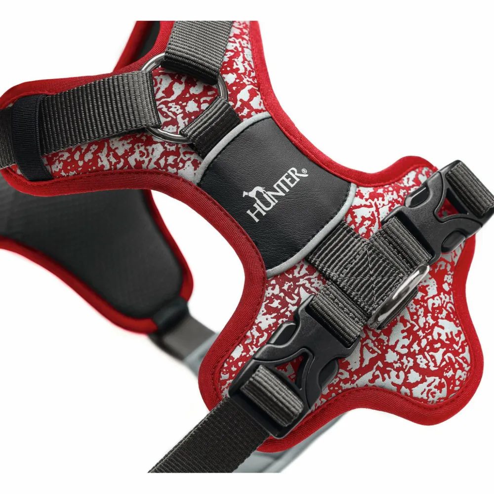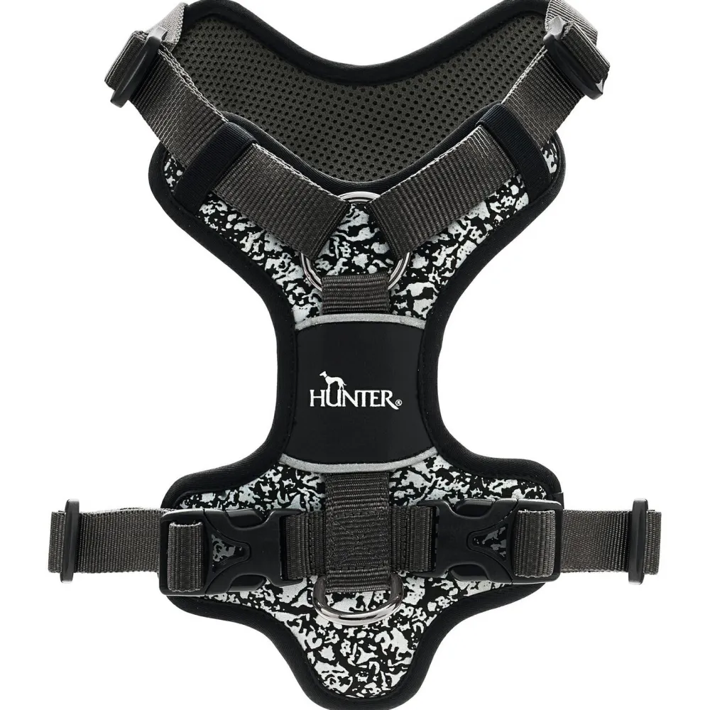 Das Harness Divo Reflect von Hunter bietet neben der ergonomischen Passform, einen hohen Komfort durch eine atmungsaktive Polsterung aus weichem Mesh-Material und viel Sicherheit in der Dämmerung und im Nebel. Das umlaufende reflektierende Material und der Camouflage-Print harmonieren besonderes gut mit dem Hundefell und sorgen bestimmt für einige Blicke und es fällt bei Tageslicht und in der Dunkelheit auf. Der zweite D-Ring ermöglicht das Anleinen auch im Brustbereich. Dank der 5-fachen Verstellmöglichkeiten lässt sich das Geschirr ganz individuell auf die Bedürfnisse und dem Körperbau der Fellnasen anpassen und sitzt wie eine zweite Haut.