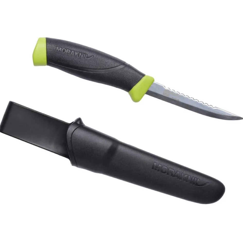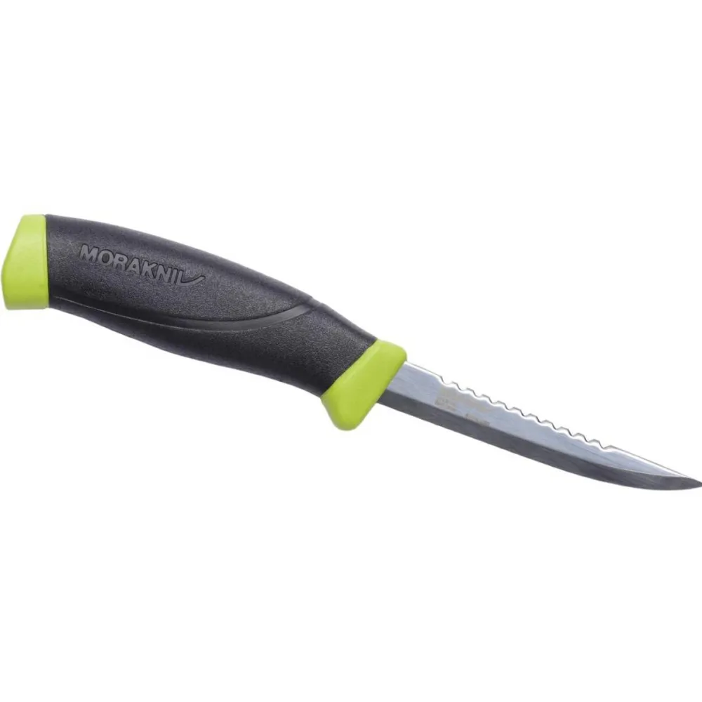Das Fishing Comfort 098 aus der Companion Serie von Morakniv ist ein superpraktisches Fischmesser mit smarten Details. Die Klinge aus recyceltem Stahl ist mit knapp 10cm nicht megalang, aber praktisch vor Allem für das Filetieren nicht zu großer Fische. Auf dem Klingenrücken befindet sich eine (nicht scharfe) partielle Zahnung zum Schuppen der Beute. Der Kunststoffgriff ist aus einer extra rutschsicheren Mischung, damit Du auch bei nassen Bedingungen gefahrlos arbeiten kannst.