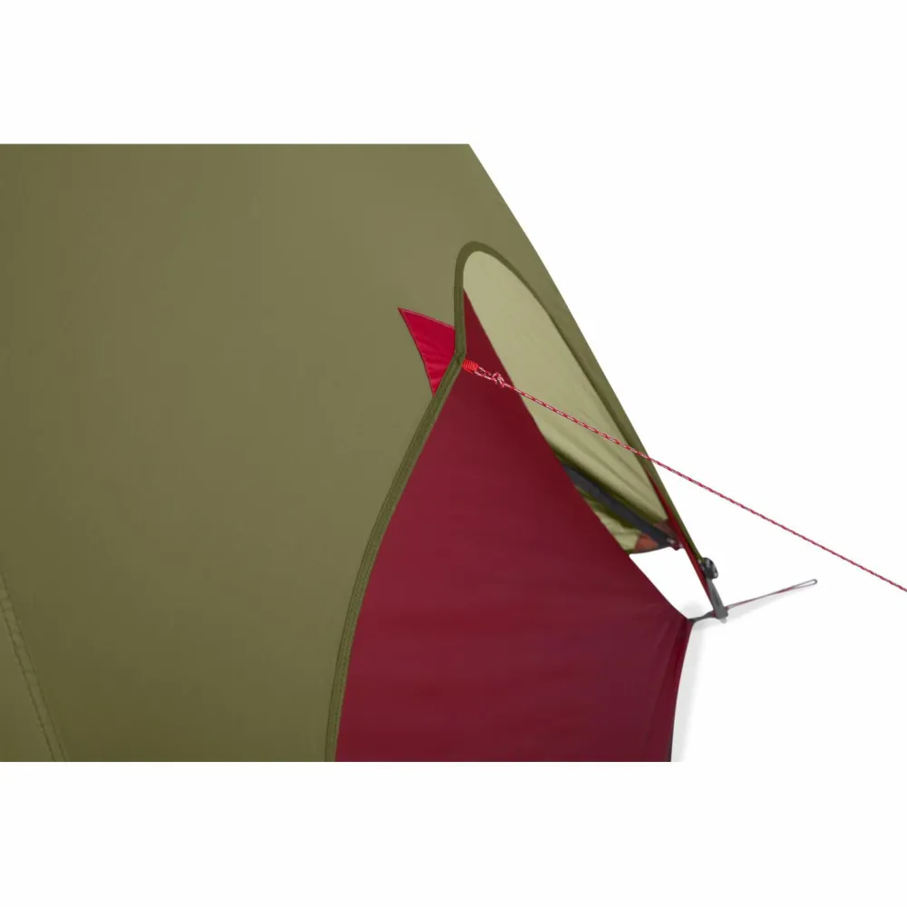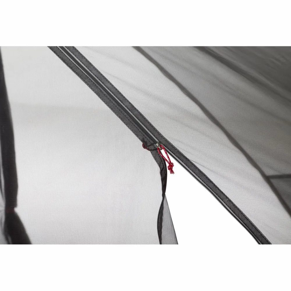 Getragen wird die wetterfeste Konstruktion von einem DAC NFL Aluminium-Gestänge in 8,7 mm Stärke. Im Innenraum ist das 221 x 84 cm große Zelt in der Mitte 100 cm hoch. Zu den 1,85 m² Innenfläche kommen noch 0,75 m² Fläche als Apsis hinzu. MSR ergänzt den komfortablen Innenraum mit praktischen Taschen, die alle über Kabeldurchführungen verfügen. Das Zelt wird komplett mit Zeltheringen, Abspannleinen, Aufbauanleitung und Packsack geliefert. Mit allem Zubehör lässt sich das MSR Zelt für den Transport auf platzsparende 46 x 10 cm zusammenlegen.