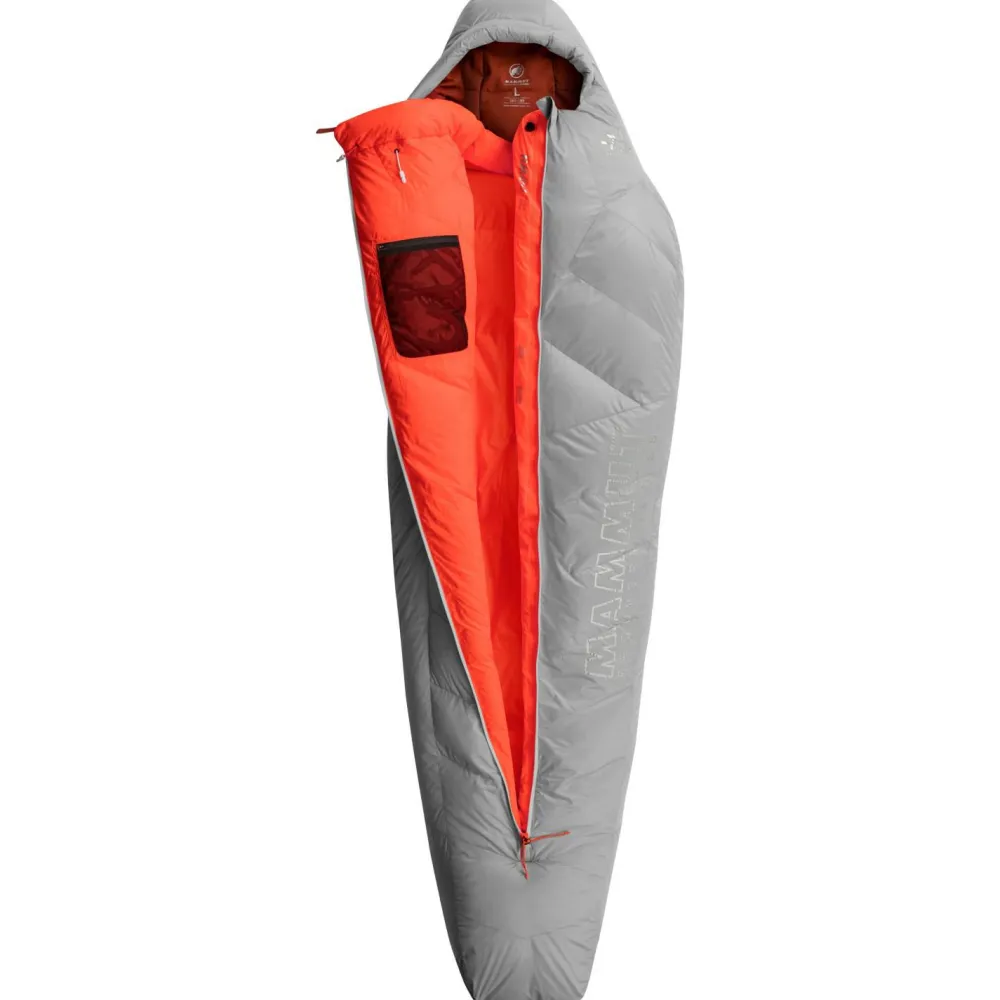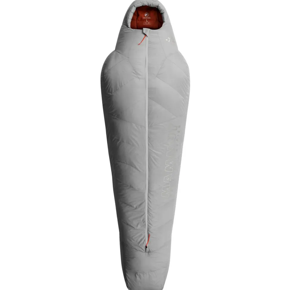 Der Perform Down Bag -7°C Daunenschlafsack ist mit 450 g recycelter Entendaune befüllt und wiegt insgesamt 1020 g. Für den Transport im Tourengepäck lässt er sich platzsparende auf 23 x 28,5 cm komprimieren. Rund um den Gefrierpunkt liegt die Komforttemperatur des 3-Season Daunenschlafsacks. Als Extremtemperatur gibt Mammut sogar -22°C an. Der Reißverschluss mit Kinnschutz reicht vom Kragen bis zur Fußbox. Er ist mittig platziert und stört somit auch nicht beim Schlafen auf der Seite. Die Kapuze mit Wärmekragen ist innen besonders weich, raschelt nicht und lässt sich individuell anpassen.