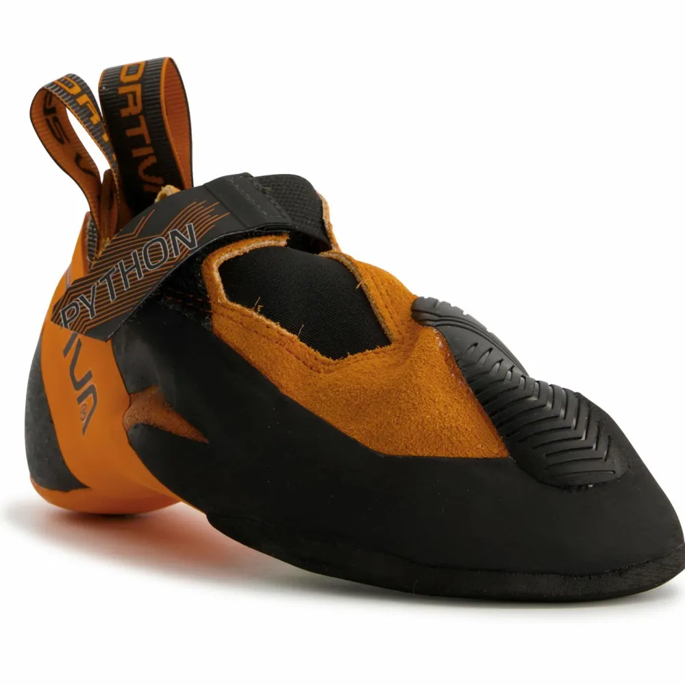 Der eng anliegende Unisex-Slipper mit dem einzelnen Klettverschlussband gibt dem Fuß satten Halt. Dabei handelt es sich beim Python um einen äußerst sensiblen Kletterschuh, der seinem Träger eine direkte Rückmeldung über die Tritte gibt. Das ausgeprägte Fersengummi macht ihn dabei perfekt für Hooks und somit zum Profi in überhängenden Routen. Der Spann ist mit einem griffigem Gummi eingefasst und sorgt so für die passende Reibung an der Wand – wenn das Problem athletischer Kopfüber-Moves bedarf oder sonst keine Lösung außer nem‘ Toe-Hook in Sicht scheint.