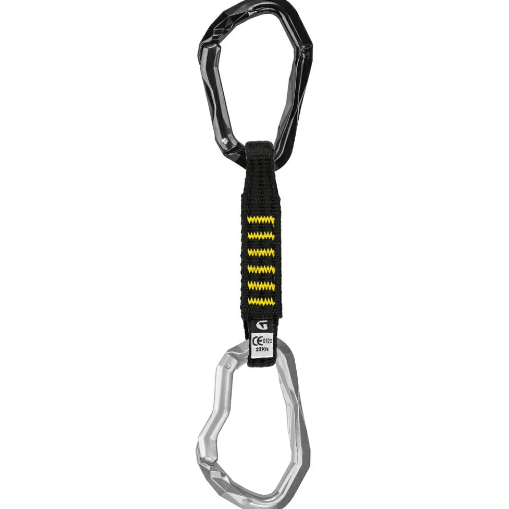Sicher und robust, so zeigt sich das Rock Safety Quickdraw Sport Stealth von Grivel. Dieses Express-Set verfügt über zwei Karabiner mit klassischem Schnapper. Durch die große Form sowie die weite Schnapperöffnung lassen sich die Karabiner besonders gut in Seil und Bohrhaken einhängen und verhaken dabei nicht. Wie es sich gehört, ist der Schnapper des unteren Karabiners gebogen, sodass beim Vorstieg das Seil schnell und einfach eingehängt werden kann. Vorbildlich: Die beiden Karabiner sind in unterschiedlichen Farben gehalten, sodass immer ersichtlich ist wie das Express-Set eingehängt werden muss.