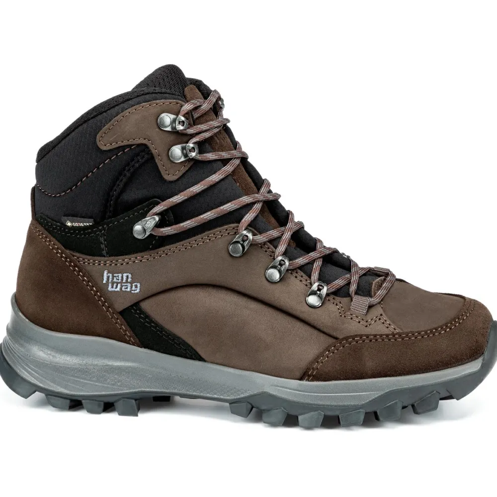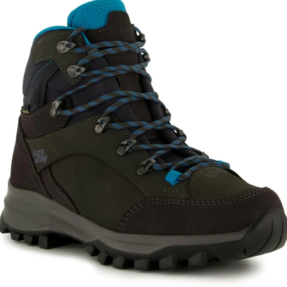 Die Women’s Banks GTX von Hanwag sind zuverlässige Allrounder mit schmalem Leisten. Dank zahlreicher praktischer Features machen diese Wanderschuhe zahlreiche Spielarten des Wanderns problemlos mit und zeigen unterwegs immer beste Performance.Die Sohle verfügt dabei über eine breite Auftrittsfläche und bietet eine optimierte Stabilität sowie einen erhöhten Gehkomfort bei langen Wanderungen. Durch die Abrundung der Sohle und die runden Profilstollen in der Mitte können sich kleine Steine und Schlamm und Dreck hier nur schlecht festsetzen.Als Obermaterial kommt hier robustes Leder zum Einsatz. Somit sind die Schuhe auch für rauere Bedingungen gut geeignet. Die Innenliegenden Nähte sind dabei gut vor äußren Einflüssen geschützt und tragen so maßgeblich zur Langlebigkeit der Schuhe bei. Durch das Innenfutter aus GORE-TEX sind die Schuhe außerdem wasserdicht und atmungsaktiv.
