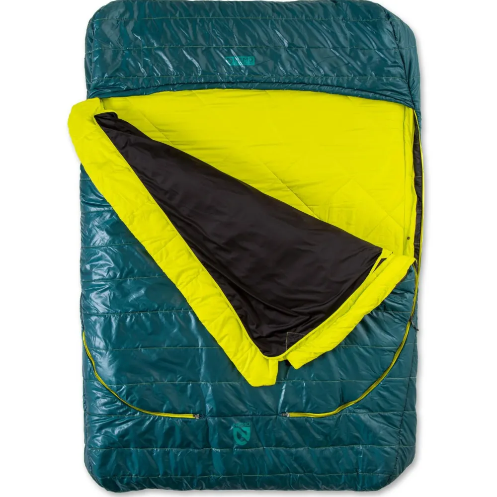 Der Jazz Double 2025 Kunstfaserschlafsack von Nemo bietet höchsten Schlafkomfort beim Camping für zwei Personen. Der Schlafsack ist mit einem integrierten Bettlaken ausgestattet, das ein Schlafgefühl wie zu Hause auch unterwegs möglich macht. An den Seiten sind jeweils 2-Wege-Reißverschlüsse angebracht. Manuelle Luftzufuhr und das seitliche Verlassen des Schlafsacks sind somit kein Problem mehr.