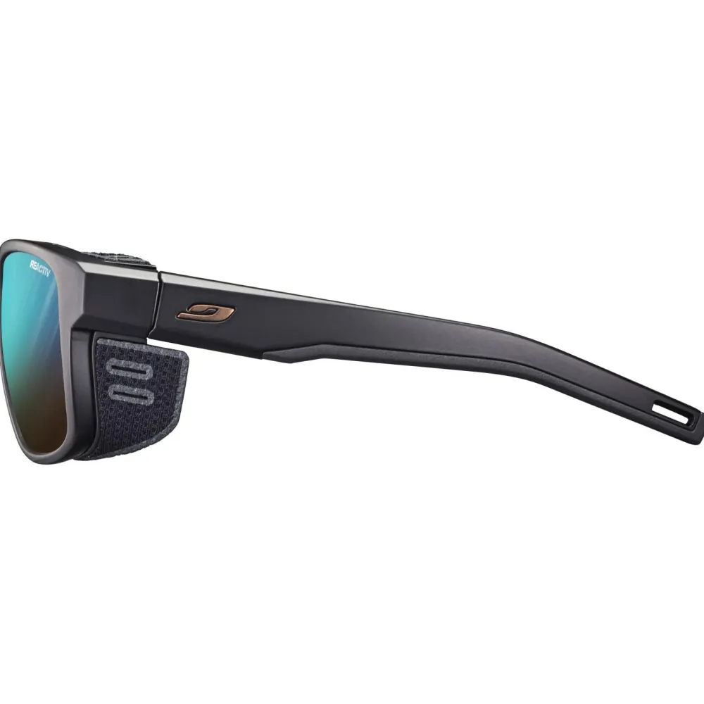 Egal ob Sommer oder Winter, die Shield M Reactiv S2-4 (VLT 7-35%) von Julbo ist immer mit dabei. Diese Gletscherbrille überzeugt durch ihren sportlichen Rahmen und praktische Details, wie die abnehmbaren Seitenteile. Gummierungen am Nasensteg und den Bügelenden verhindern zusätzlich, dass die Brille rutscht. Bei dieser Ausführung sind die Gläser selbsttönend und können sich somit schnell innerhalb der Schutzklassen 2-4 anpassen.