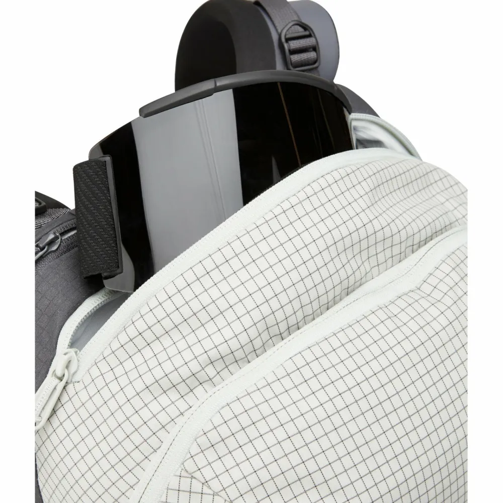 In der Innentasche mit Reißverschluss lassen sich Wertsachen verstauen. In einer gefütterten Brillentasche finden Sonenn- und Skibrillen einen sicheren Platz. Der Brustgurt des Khroma 22 ist mit einer Trillerpfeife versehen. Der obere Riemen stabilisiert die Last und untere Kompressionsriemen halten die Ladung zusammen. Dadurch kann unterwegs nichts in Bewegung kommen. Der Hüftgurt ist mit einer leicht lösbaren Schnalle und einer großen Tasche mit Materialschlaufe ausgestattet.