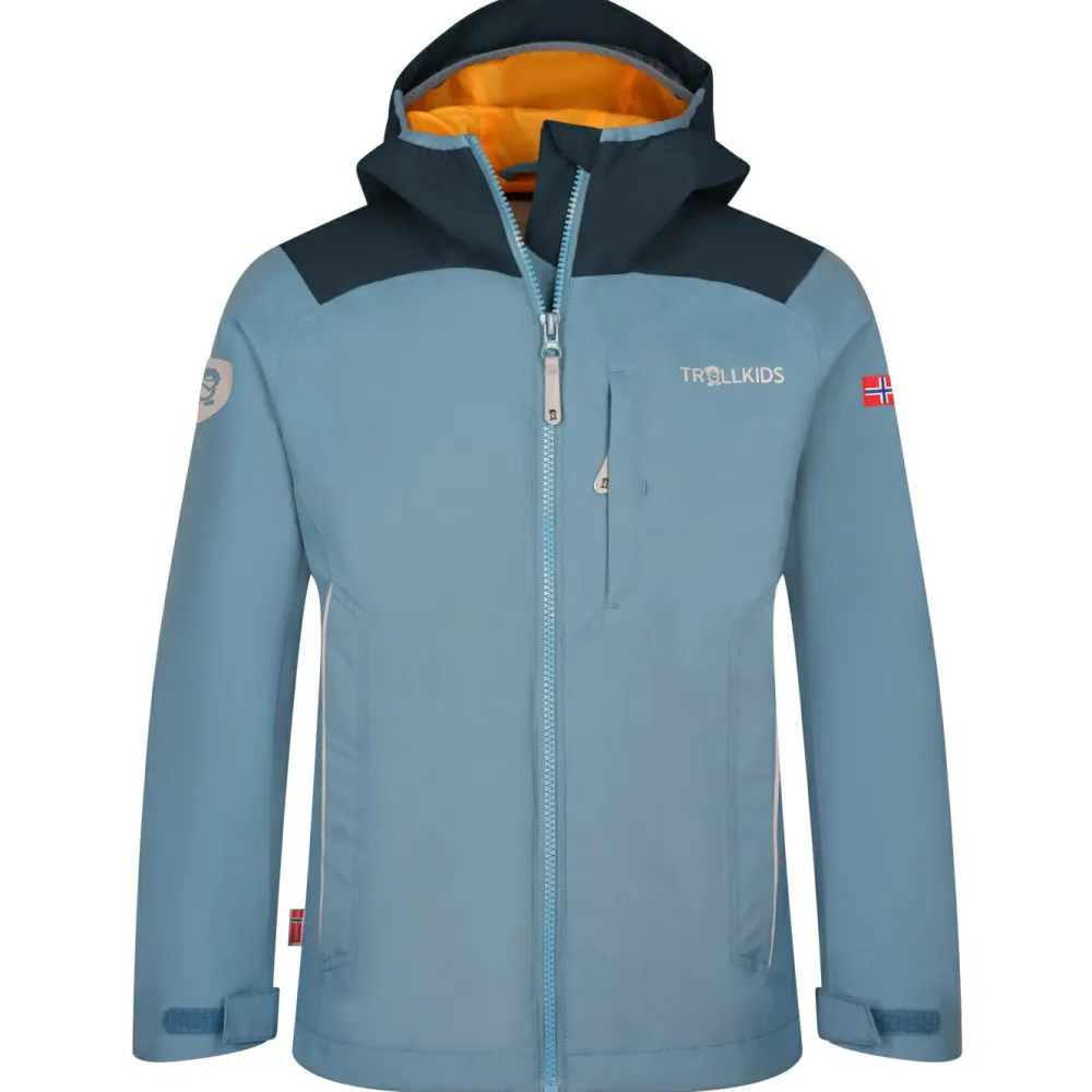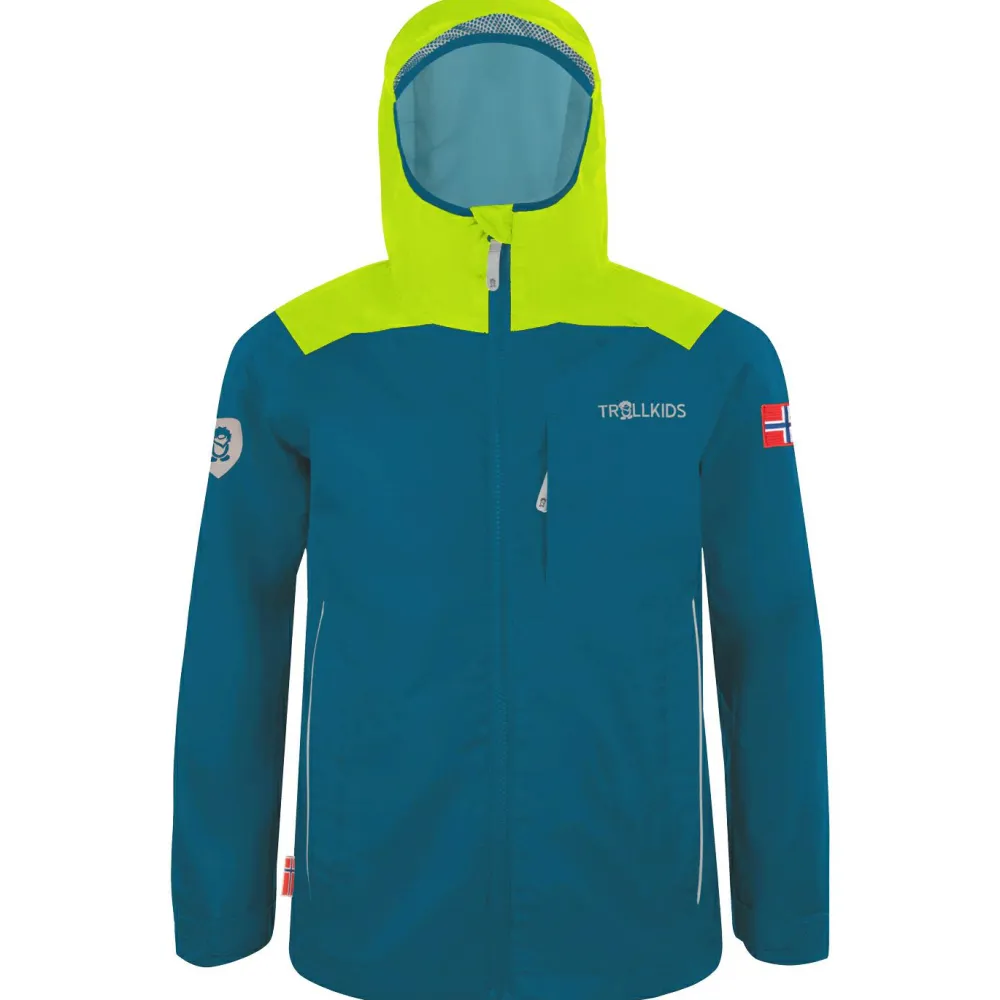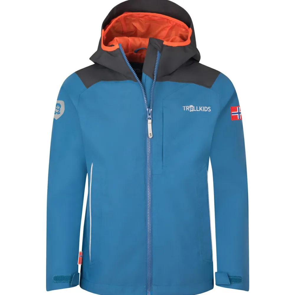 Damit trotzen abenteuerlustige Jungs und Mädchen jedem Regenschauer: Die Kids Bergen Jacket von Trollkids ist eine farbenfrohe Regenjacke für Kinder, die auch bei Wind und Wetter gerne draußen sind. Mit einer Wassersäule von 5.000 mm hält sie auf dem Weg zu Schule und Kindergarten, beim Toben im Garten oder auf Wanderungen angenehm trocken.