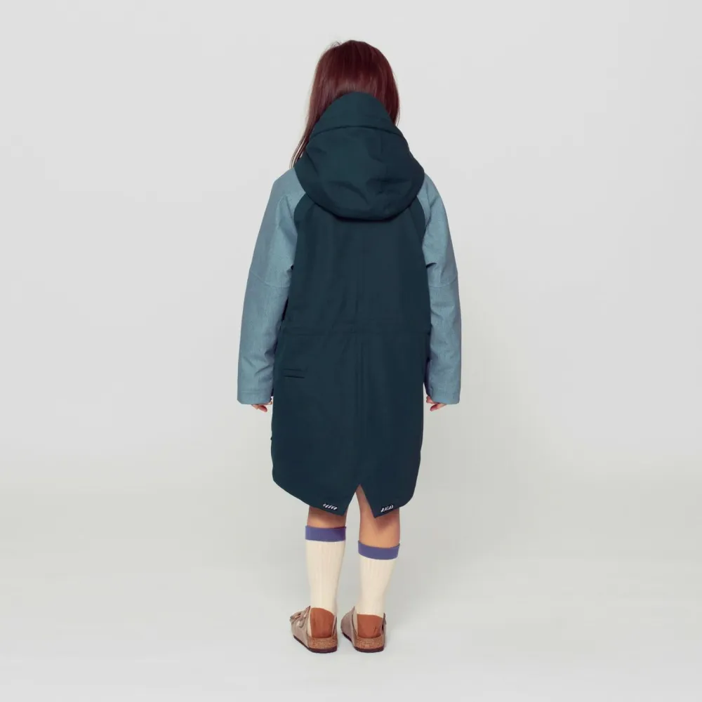 Der durchgehende Front-Reißverschluss wird durch eine Windabdeckleiste ergänzt, um kalte Luft abzuhalten. Ein Kordelzug an der Taille ermöglicht die Anpassung der Passform, und Klettverschlüsse an den Ärmeln bieten zusätzlichen Schutz. Der hintere Saum mit Schlitz sorgt für Bewegungsfreiheit, und die Kapuze mit Schirm schützt vor Niederschlag.
