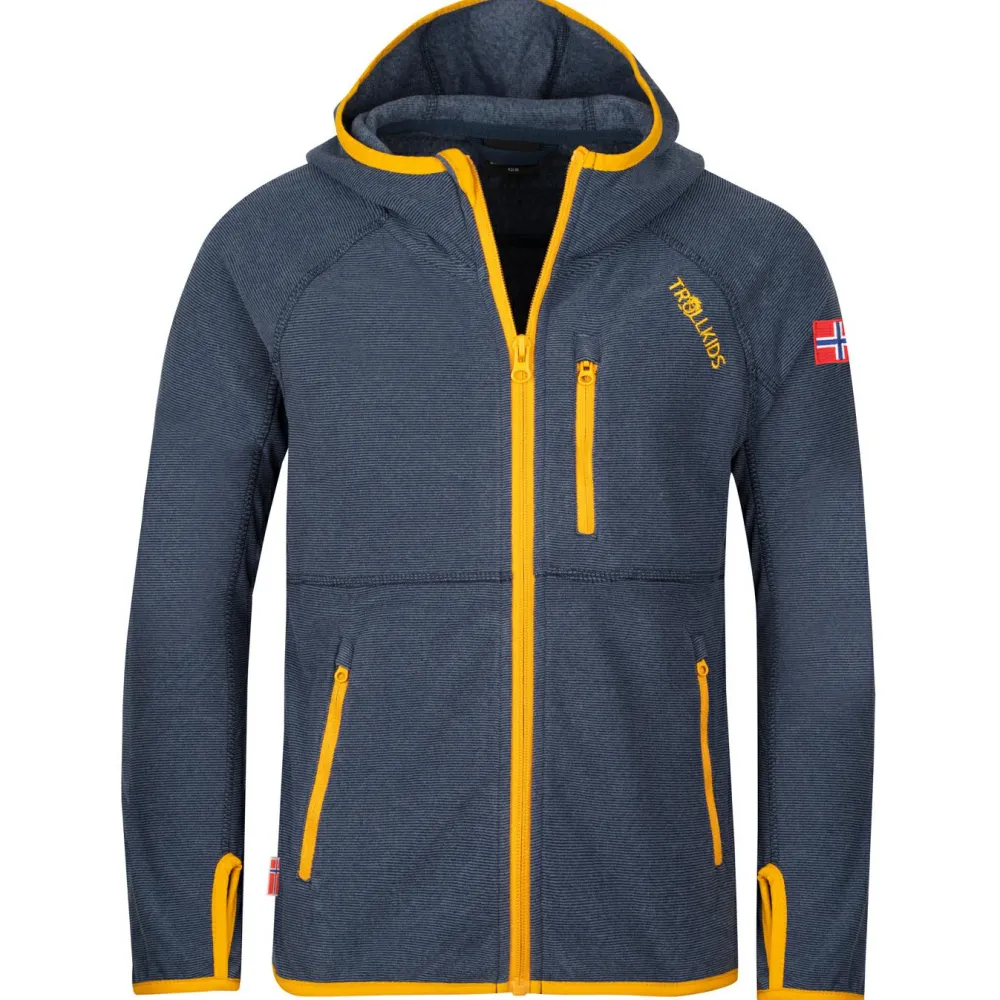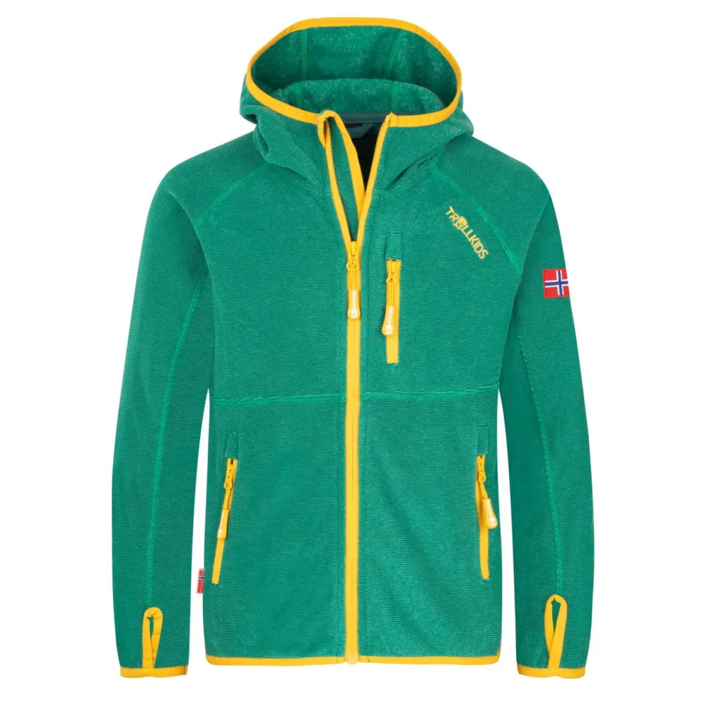 Mit der kuschligen Fleecejacke Kids Sanderfjord Jacket von Trollkids sind Mädchen und Jungs angenehm warm angezogen. Die körpernah geschnittene, leichte Fleecejacke in kindgerechtem Design hält trotz ihres geringen Gewichts angenehm warm und ist mit einer gut sitzenden Kapuze ausgestattet. Elastische Ärmelbündchen und ein elastischer Saum halten die Wärme am Körper und optimieren die Passform. Drei Taschen mit Reißverschluss bieten Stauraum für alles, was Kinder unterwegs gerne dabei haben. Mit schönem, gesticktem Trollkids-Logoprint am Ärmel.