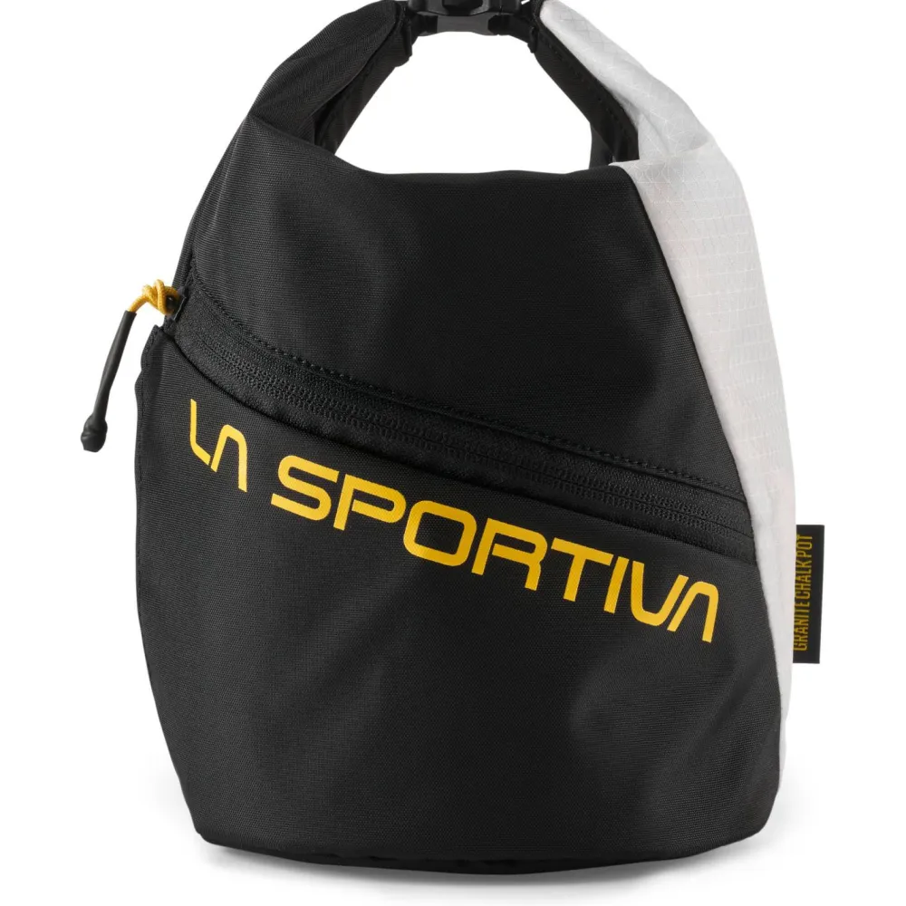 Der Granite Chalk Pot von La Sportiva besteht aus abriebfestem ROBIC Nylon, das gut für den anspruchsvollen Dauereinsatz im Freien geeignet ist. Die breite Öffnung erlaubt ein schnelles und einfaches chalken, während ein magnetischer Rollverschluss mit Clip dafür sorgt, dass beim Transport kein Chalk verloren geht. Dank der standfesten Konstruktion kannst du dich sorgenfrei auf das Erobern der Wand fokussieren. Hinzu kommen zwei elastische Bürstenhalter sowie eine flexible Reißverschlusstasche, die Stauraum für kleinere Gegenstände liefert.