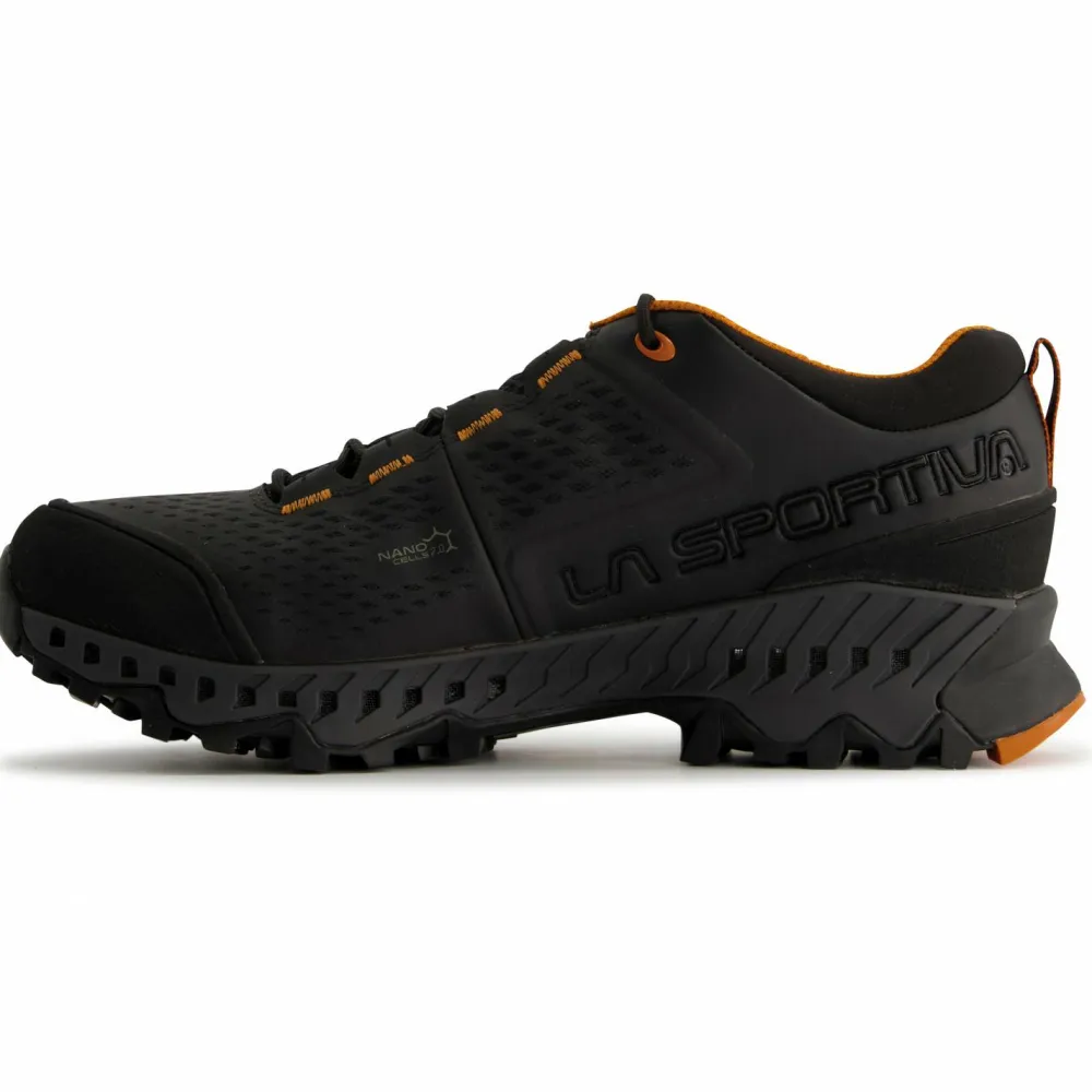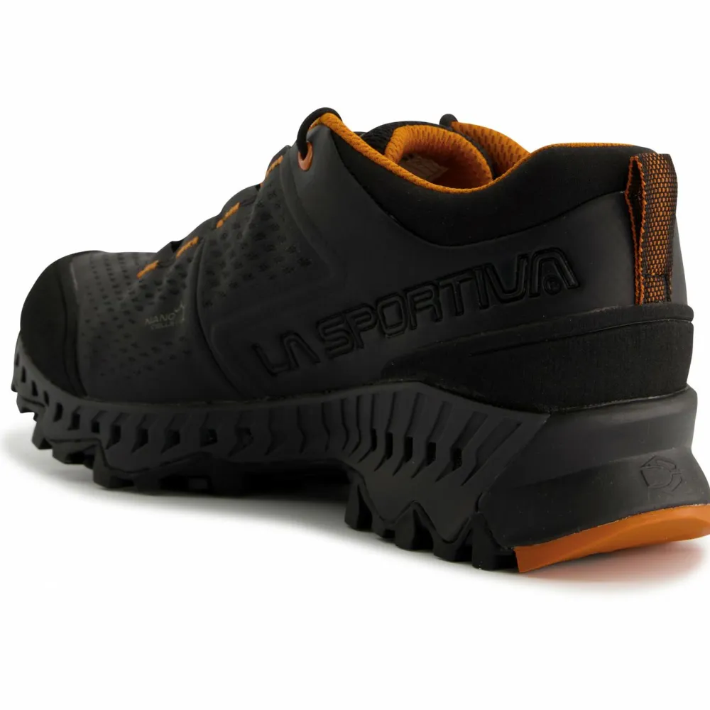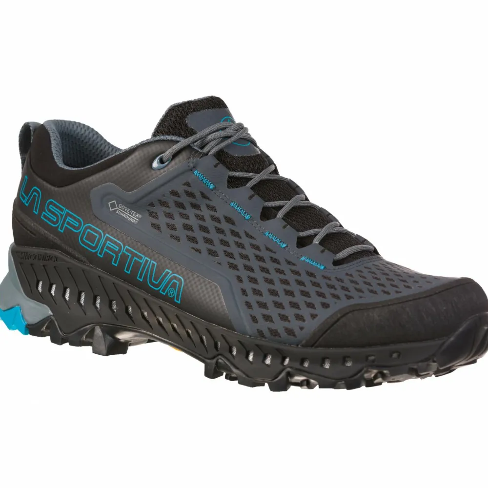 Die Kombination aus leichtem Mesh-Gewebe und der GORE-TEX Surround Technologie machen die Spire GTX Multisportschuhe von La Sportiva so hervorragend belüftet. Durch die Sohlenkonstruktion kann Wärme und Feuchtigkeit über Belüftungskanäle zu den seitlichen Öffnungen im Schuhrand geleitet werden. Da bleibt der leichte Sportschuh mit der griffigen Vibram XS Trek Sohle auch bei anstrengenden Läufen im Gebirge angenehm trocken. Für optimales Tragegefühl sorgen außerdem das Ortholite Mountain Hiking Fußbett und die dämpfende EVA Zwischensohle. Kleine Nylonnetze vor den Belüftungsöffnungen verhindern, dass die Kanäle verstopfen. Eine komfortable Schnürung und eine Anziehschlaufe an der Ferse komplettieren den leichten Outdoorschuh von La Sportiva.