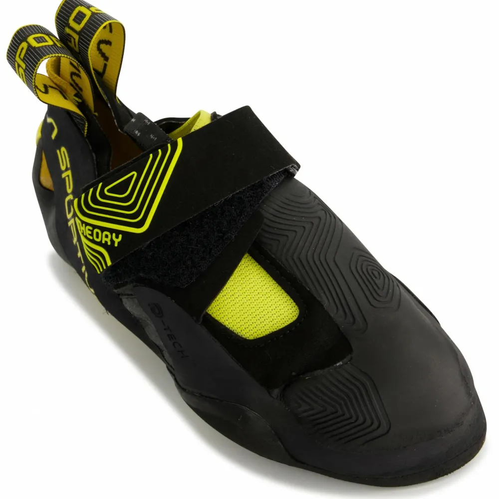 Die Theory von La Sportiva sind sehr weiche, reaktionsfreudige Kletterschuhe für Profis. Ihr Fokus liegt auf modernem Indoor-Bouldern. Überall dort, wo ein Höchstmaß an Reibung und Dynamik sowie eine große Variabilität in der Fußarbeit gefragt sind, spielen die Theory ihre Stärken aus. Spektakuläres, sehr volumenlastiges Bouldern im Wettkampfstil ist eindeutig die Domäne dieser Schuhe.