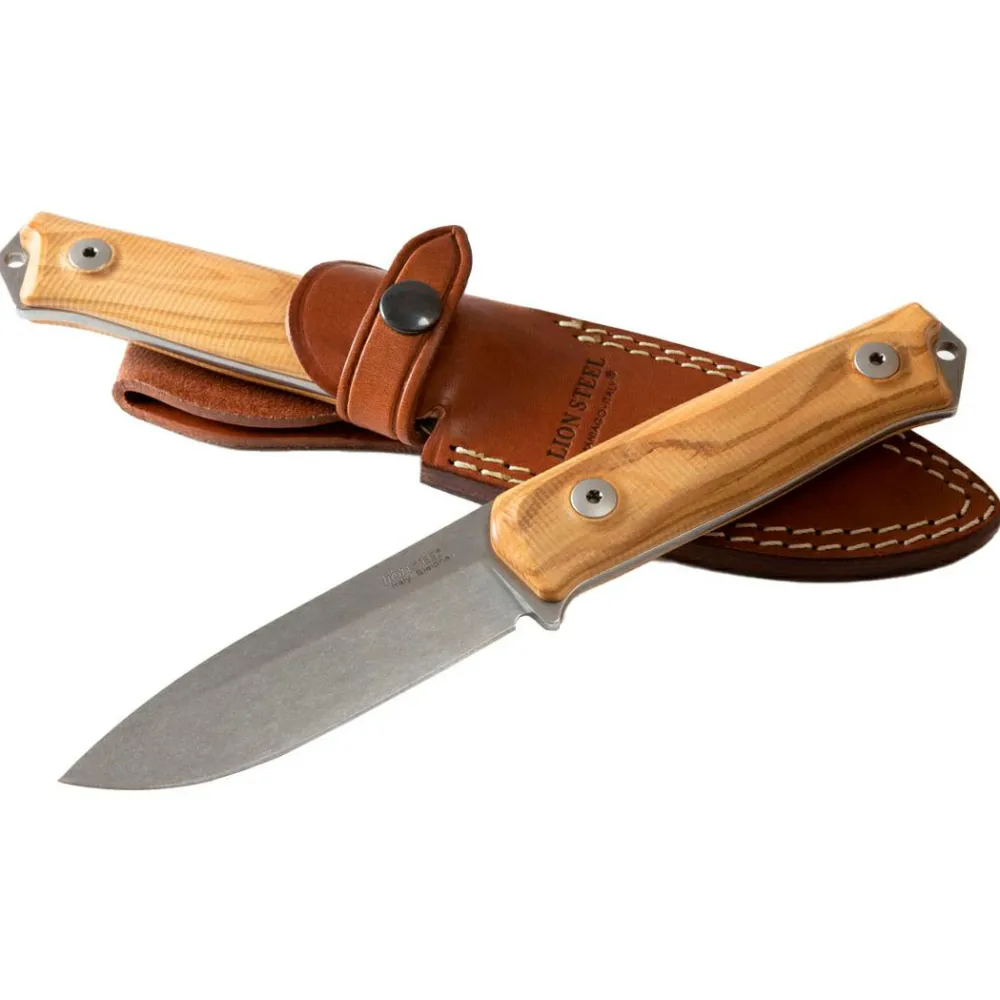 Das B41 von LionSteel aus der italienischen Messerstadt Maniago ist ein Bushcraft-Messer wie aus dem Bilderbuch. Eine harte und kräftige, gut 10cm lange Klinge aus schwedischem Sleipner Stahl des Qualitätsherstellers Uddeholm scheut vor keiner noch so kniffligen Arbeit zurück. Der durchgehende Erl steht oben und am Ende leicht über die eigentliche Griffpartie hinaus, und kann in Verbindung mit einem Feuerstahl zum Funkenschlagen genutzt werden. Die geriffelten Griffbacken (wahlweise aus grünem Micarta, Sanots- oder Olivenholz) garantieren besten Grip, und das Messer kommt in einer klassischen, robusten Lederscheide mit Knopfsicherung.