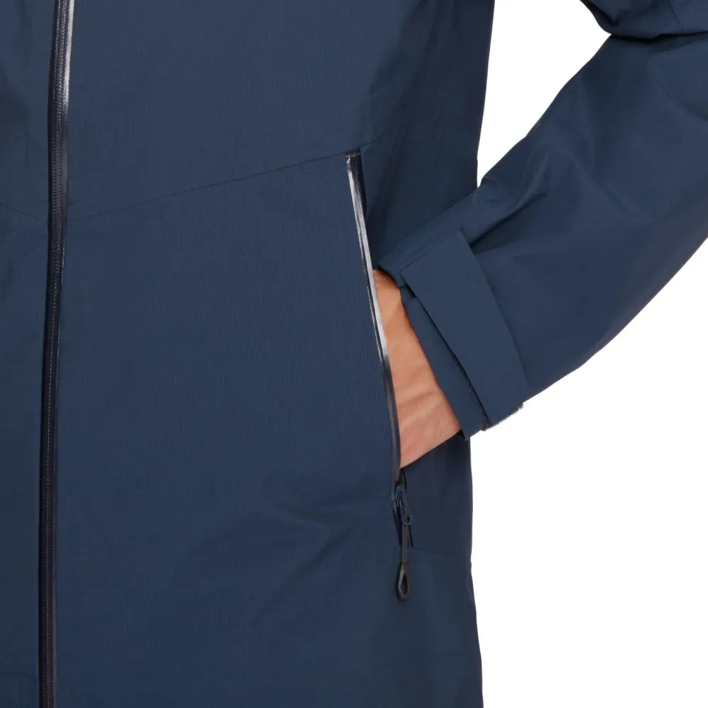 Mammut stattet die Hardshelljacke mit zwei Seitentaschen und wasserabweisenden Reißverschlüssen aus. Außerdem sorgen Ventilationsöffnungen mit Reißverschlüssen unter den Armen für individuell regulierbare Belüftung. So ist die Jacke auch bei anstrengenden Anstiegen stets gut belüftet.