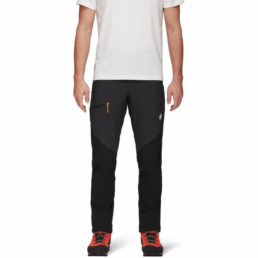 Die hochwertige Hybrid-Softshell-Hose Courmayeur SO Pants hat Mammut für ambitionierte Bergsportler entwickelt. Dank ihres hoch atmungsaktiven, elastischen und windabweisenden Schoeller-Softshell-Materials ist sie vielseitig einsetzbar, angenehm zu tragen und gibt unheimlich viel Bewegungsfreiheit. Das robustere Double-Weave-Material im Gesäß-, Knie- und unteren Beinbereich ist besonders abriebfest und scheut auch den Kontakt mit Fels nicht. Die Taillenbundverstellung lässt sich von außen bedienen und sorgt für einen perfekten Sitz. Ein asymmetrisch geformter Saum und ein verstaubarer Befestigungshaken garantieren eine optimale Passform der Hose über den Bergschuhen. Die Beinenden lassen sich zusätzlich durch Druckknöpfe in der Weite verstellen.