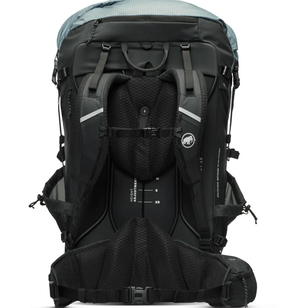 Mit 50 Liter Volumen, die sich auf bis zu 60 Liter erweitern lassen, bietet der Women’s Ducan Spine 50-60 Wanderrucksack von Mammut eine Menge Stauraum für mehrtägige Touren und Wanderungen. Dabei begeistert der Tourenrucksack durch sein ergonomisch optimiertes Tragesystem mit Active Spine 3.0 Technology. Es passt sich perfekt den Bewegungen der Wirbelsäule an und sorgt mit Netzrücken und Metallrahmen für die nötige Mischung aus Ventilation und Kraftübertragung. Der große Rucksack wird per Rolltop mit Reißverschluss verschlossen und verfügt zusätzlich über eine großzügige Reißverschlussöffnung zum Hauptfach. Eine abnehmbare Regenhülle, seitliche Taschen und Halterungen für Trekkingstöcke ergänzen den komfortablen Wanderrucksack für ausgedehnte Touren.