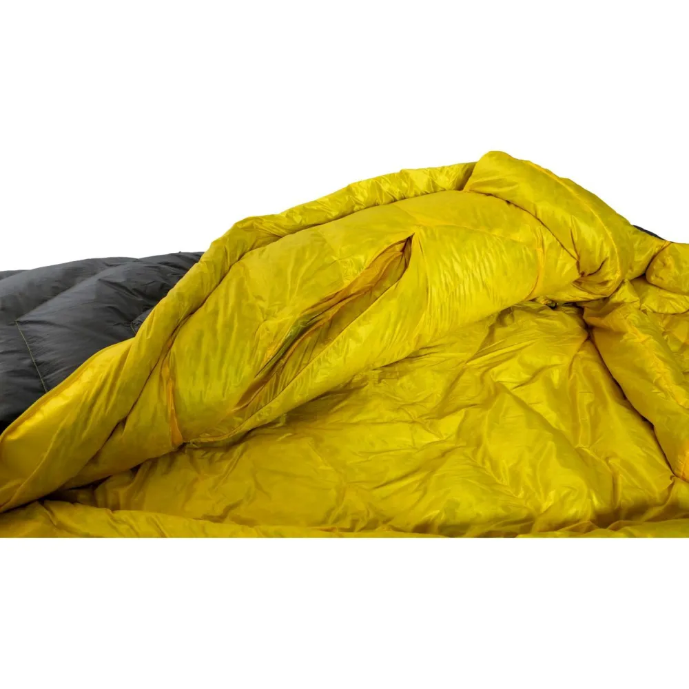 Der Daunenschlafsack wartet mit einer Komforttemperatur von 0°C auf, ist aus recycelten Rohstoffen gefertigt und bluesign zertifiziert. Das Ripstop-Obermaterial ist super widerstandsfähig und kommt mit einer DWR für den nötigen Schutz vor Kondensnässe. Das softe Taft-Innenfutter fühlt sich klasse an und sorgt für Komfort. Das Herzstück des Schlafsacks ist allerdings die 800 cuin RDS-zertifizierte Daunenfüllung. Die bietet exzellenten Wärmerückhalt, ist hydrophob und dank der cleveren chevron Daunenkammern super wärmeeffizient und verrutschfrei gelagert.