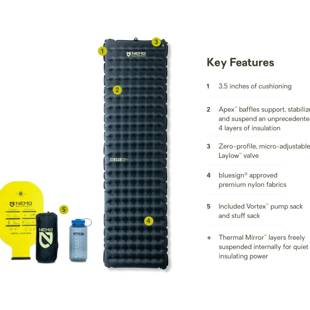 Die Tensor Extreme Conditions Isomatte ist bluesign zertifiziert und wird aus Nylon und recyceltem Nylon gefertigt. Sie ist mit einem Laylow Ventil ausgestattet und wird mit dem Vortex Pumpsack einfach und effizient befüllt. So gelangt auch keine Feuchtigkeit durch die Atemluft in die Isomatte.