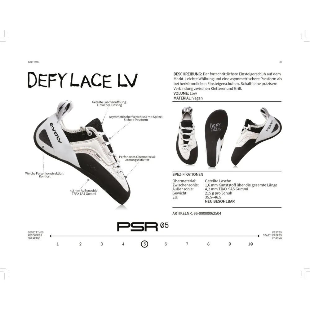 Der Defy Lace LV verfügt über eine praktische geteilte Laschenöffnung, die das An- und Ausziehen erleichtert. Die Schnürung ist nicht nur sicher, sondern bietet auch einen individuellen Sitz bei gleichzeitig hoher Sensitivität – perfekt für das feine Gespür beim Klettern. Außerdem sorgt die weiche Fersenkonstruktion für Komfort, sodass Du Dich ganz auf Deinen nächsten Zug konzentrieren kannst.