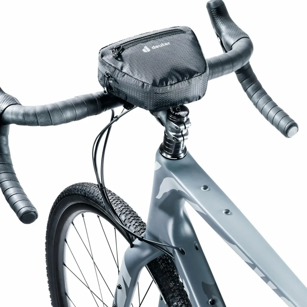 Alles fix im Griff auf der Radltour: die Front Bag von deuter bringt Stauraum an den Lenker! Die praktische und kompakte Lenkertasche ist aus einem recycelten, leichten und robusten Kunstfasergewebe gefertigt. Das Hauptfach bietet mit einem Gesamtvolumen von bis zu 1,2 Litern Platz für Smartphone, Geldbeutel, Schlüssel oder Tools. Eine kleine Zip-Fronttasche ist als Ergänzung mit am Start. Das kürzbare Klettverschlusssystem erlaubt eine feste Fixierung an allen gängigen Lenkertypen. Reflektierende Prints erhöhen die Sichtbarkeit der Front Bag bei schlechten Lichtverhältnissen. Top!