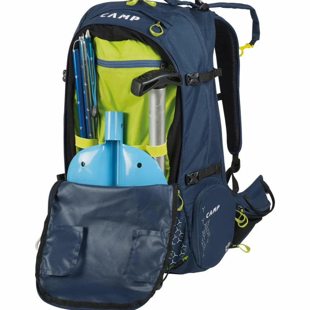 Der Hüftgurt ist auf beiden Seiten mit praktischen Taschen und Materialschlaufen ausgestattet. Ein LVS-Organizer für Schaufel und Sonde sorgt im Frontfach für Ordnung. Ein kleines Innenfach bietet Platz für Wertsachen. Pickel, Skitourenstöcke und Eisgerät lassen sich bequem auf der Außenseite anbringen. Die Steigeisen lassen sich von außen im Bodenfach verstauen, ohne den geräumigen Ski Raptor 30 Skitourenrucksack von Camp dafür vom Rücken abnehmen zu müssen.