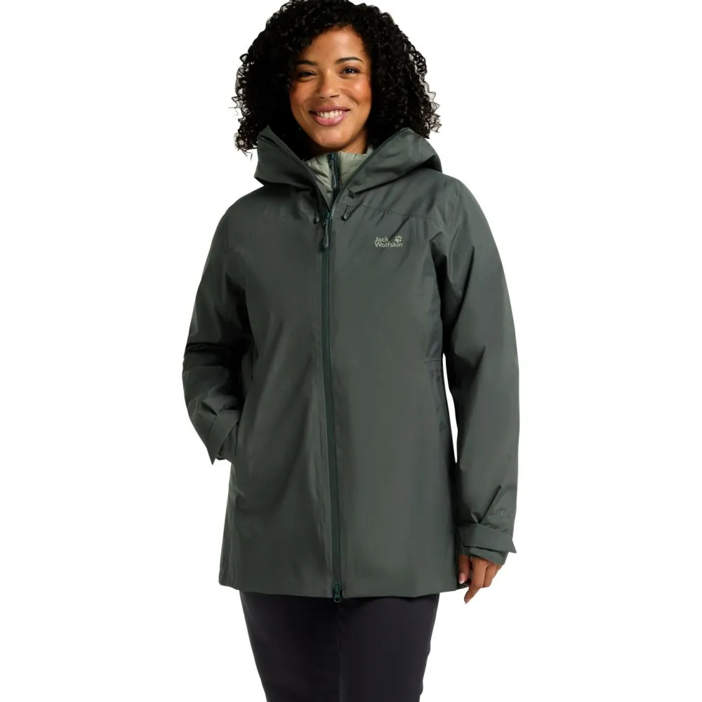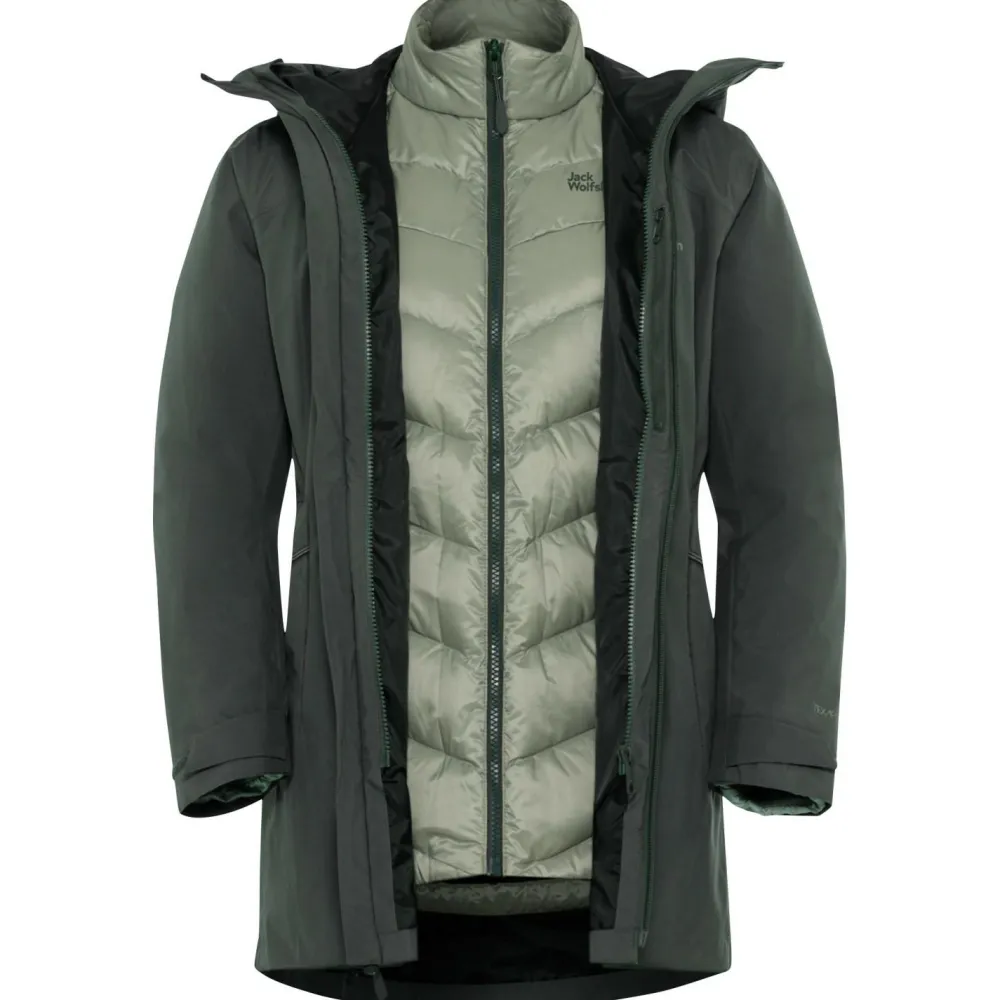 Die Women’s Icecape 3in1 Down Jacket RDS von Jack Wolfskin kannst Du vielseitig tragen. Sie ist atmungsaktiv, schnelltrocknend, wasser- und winddicht und zudem isolierend. An besonders kalten Tagen kannst Du die Jacke zusammen mit der Innenjacke tragen. Wenn die Temperaturen milder sind, kannst Du beide Jacken auch separat voneinander anziehen.