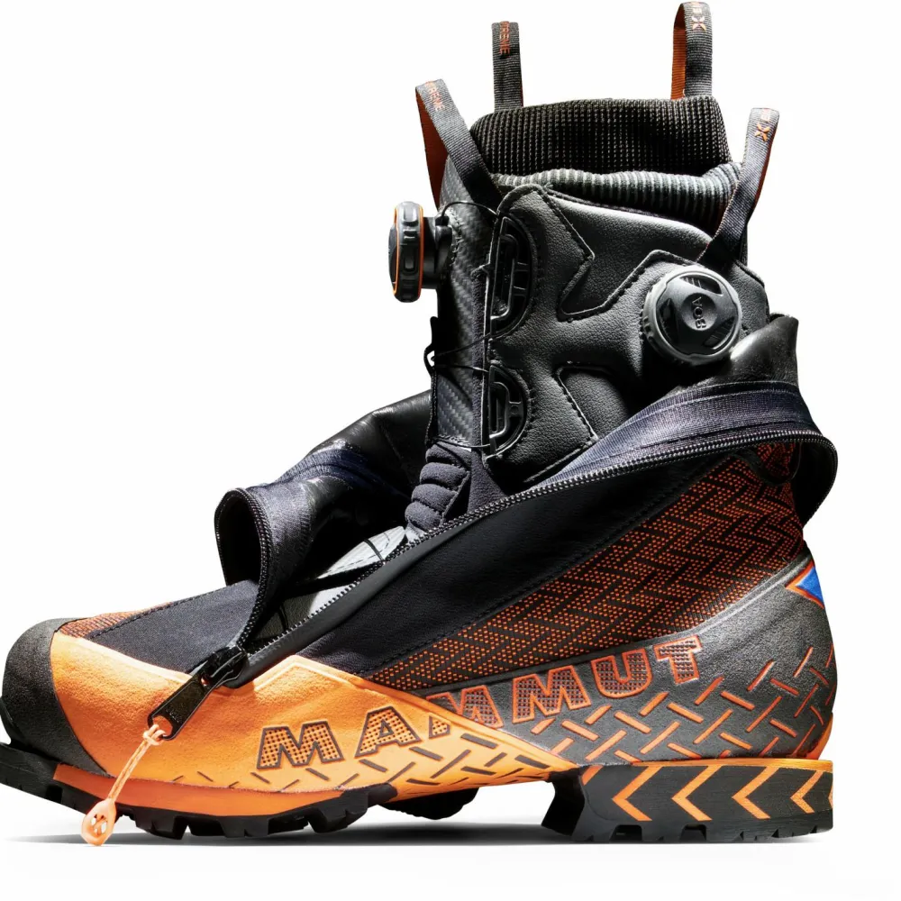 Die Ascension Expedition Litebase Sohle von Vibram bietet auch ohne Steigeisen hervorragenden Grip auf Fels, Geröll und Schnee. In Kombination mit den Steigeisen verschmelzen die Schuhe zu einer griffigen Einheit, die selbst vor vertikalen Eisflächen nicht zurückschreckt. Am Innenschuh der robusten Bergstiefel sorgt eine Boa-Drehverschluss in einer Zwei-Zonen-Schnürung für einfache Bedienbarkeit und präzise Passform. So sitzen die Mammut Schuhe absolut perfekt und ohne zu rutschen oder dabei zu drücken.