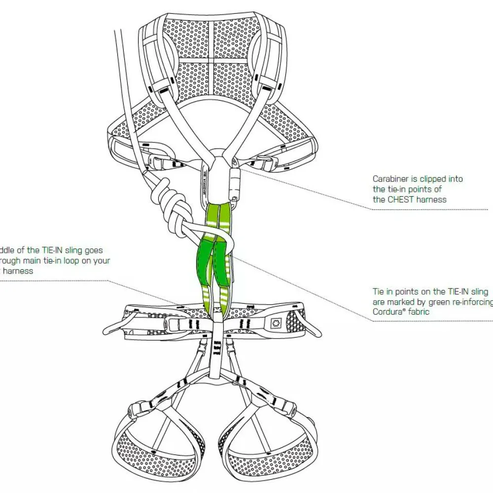 Der Brustgurt lässt sich aufgrund der beiden Slide-Lock-Schnallen problemlos verstellen und sitzt so auch mit mehreren Kleidungsschichten noch angenehm. Besonders praktisch ist aber auch die Verbindeschlinge. Diese wird einfach zur Hälfte durch die Anseilschlaufe des Sitzgurts geführt. Daraufhin werden die beiden Enden nach oben geklappt und mittels Karabiner am Brustgurt eingehängt. Ein Seil oder eine Klettersteigset, kann daraufhin in die Anseilschlaufen der Verbindeschlinge eingebunden werden.