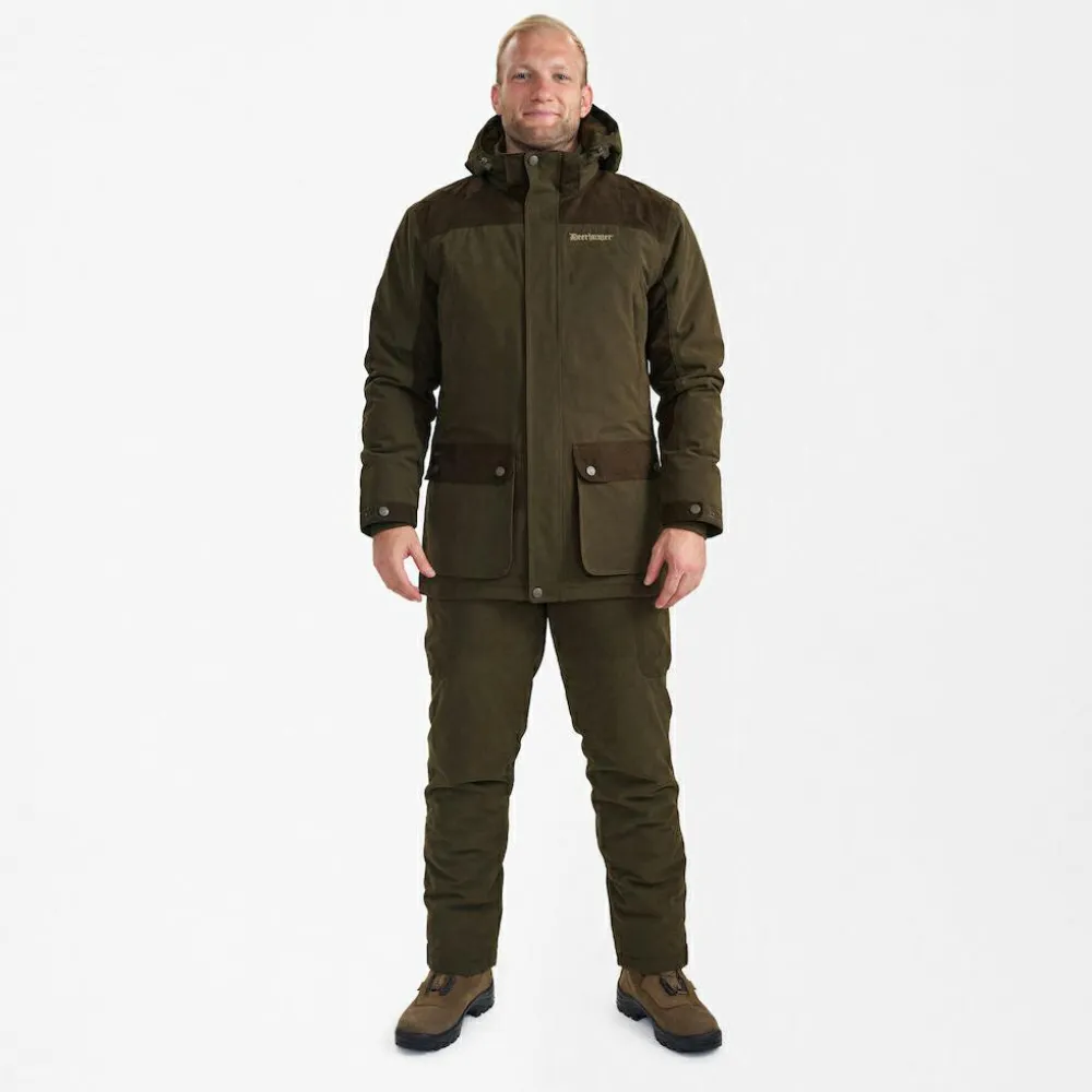 Deerhunter sorgt mit einer isolierenden Schicht aus Deer-Tex in 100 g/m² bzw. 120 g/m² Materialstärke für eine exzellente Wärmeleistung. So hält die wetterfeste Eagle Winter Jacket Outdoorjacke Wanderer und Jäger auch bei niedrigen Temperaturen stets angenehm warm. Die gefütterte Hardshelljacke verfügt über Verstärkungen aus Veloursleder im Schulterbereich und ist am durchgehenden Zwei-Wege Frontreißverschluss durch eine breite Windabdeckleiste geschützt. Zwei große aufgesetzte Fronttaschen und zwei Innentaschen mit Reißverschluss bieten eine Menge Stauraum. Auch eine extra Tasche mit Halterung für ein Funkgerät ist in die warme Jacke integriert.