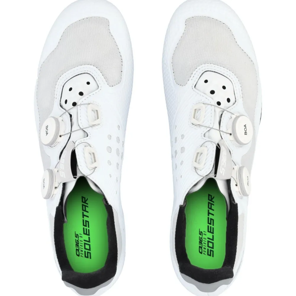 Der entscheidende Unterschied liegt unter der Sohle: Statt auf maximale Steifigkeit um jeden Preis zu setzen, verwendet Q36.5 hier einen Verbund aus Carbonfasern und Nylon. Das Ergebnis ist eine perfekte Balance für Ausdauerfahrten: Die Sohle ist steif genug für effizienten Vortrieb, bietet aber genügend Flex, um Vibrationen auf rauem Asphalt zu schlucken und deine Gelenke zu schonen. Unterstützt wird dieser Komfort durch die hochwertigen SOLESTAR-Einlegesohlen, die den Fuß permanent in einer stabilen, neutralen Position halten.