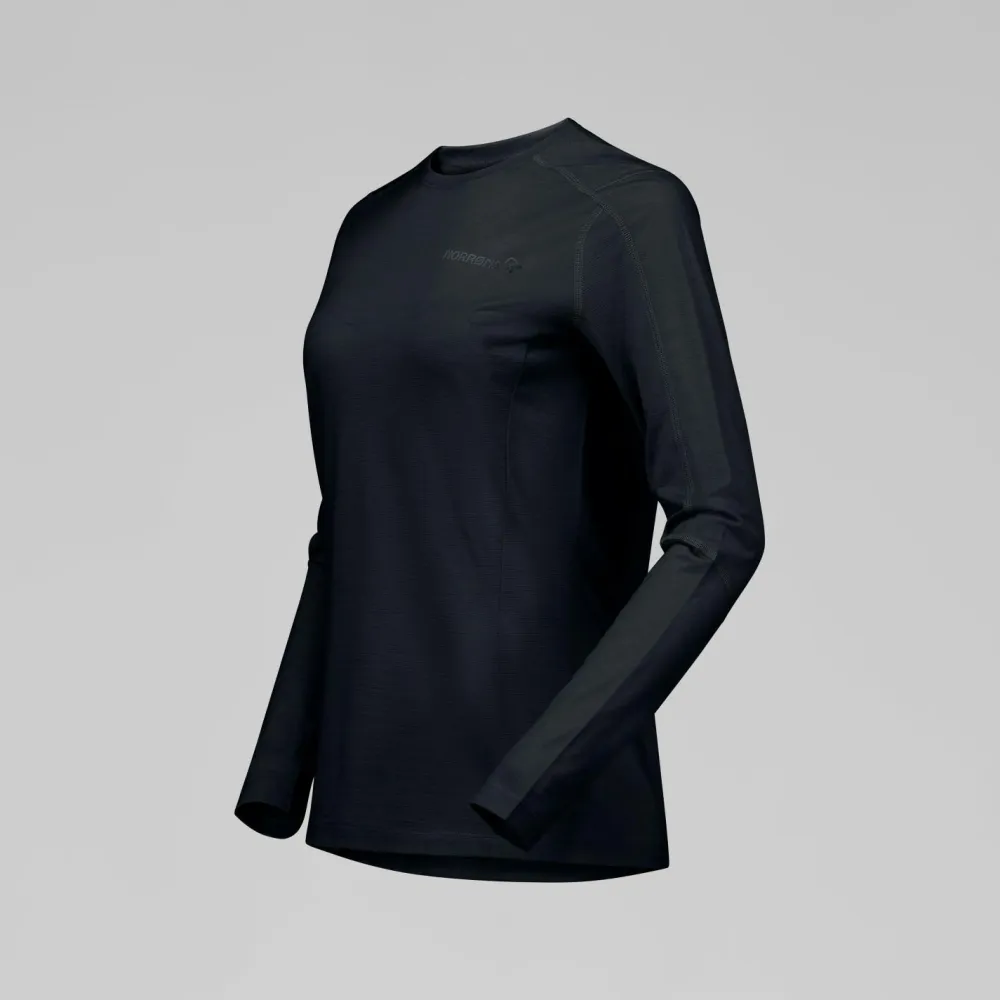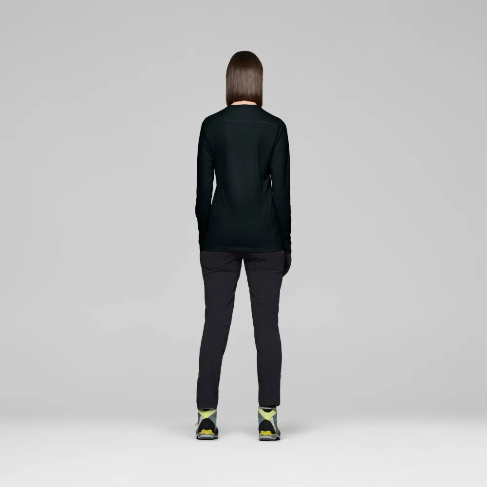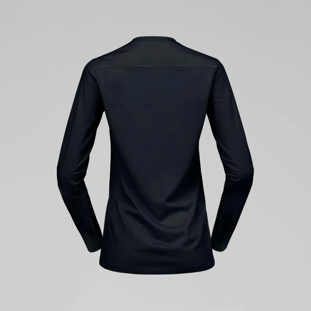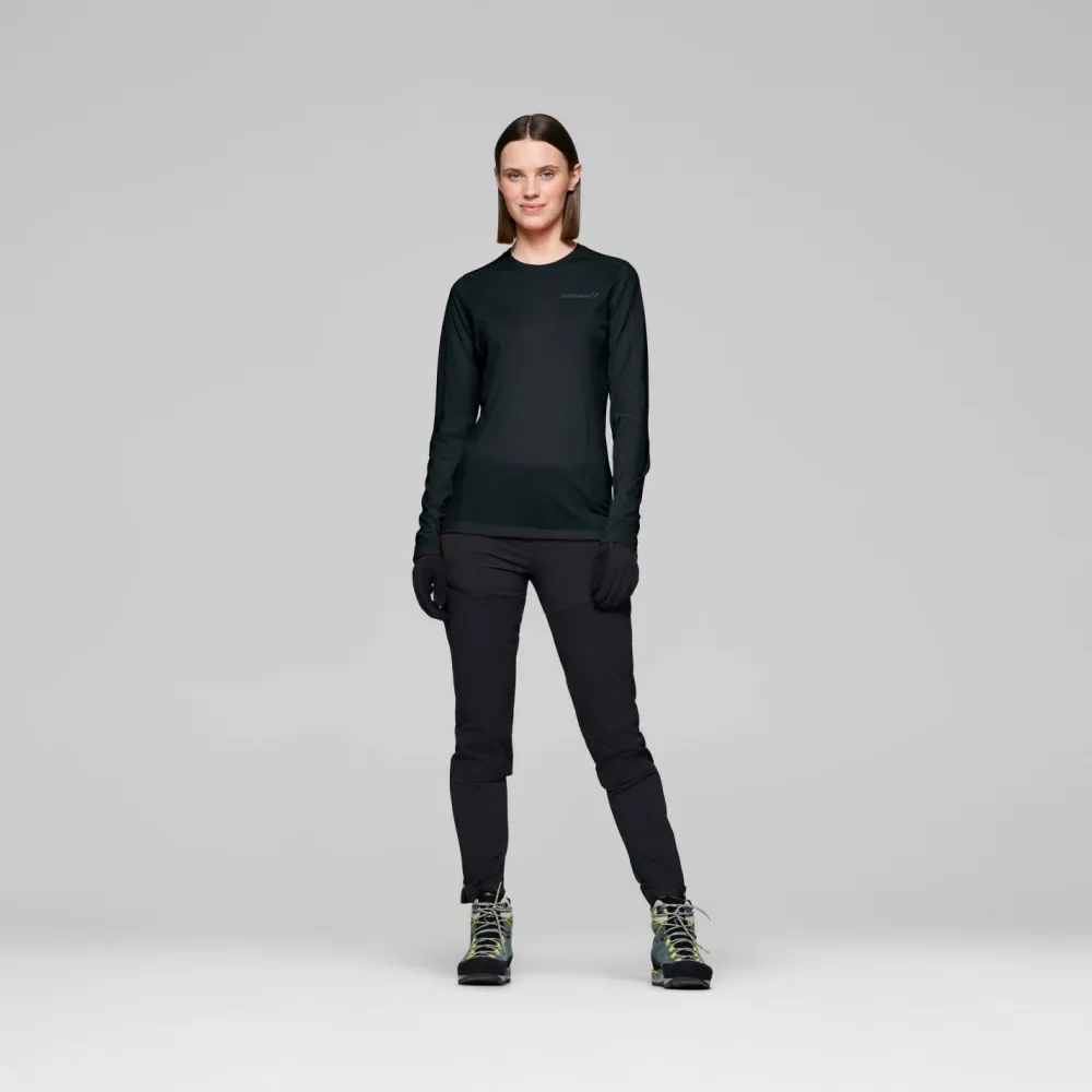 Das Women’s Falketind EqualiserUll Long Sleeve von Norrøna begleitet Dich zuverlässig auf jeder Skitour. Dank des Rundhalsausschnitts sitzt das Shirt angenehm am Hals, während Flachnähte lästiges Scheuern verhindern – besonders bei langen Tagen im Schnee ein echter Vorteil. Mit einer Materialstärke von etwa 125 g/m² ist das Shirt leicht, aber dennoch schützend, sodass Du es flexibel als Baselayer oder solo tragen kannst. Die Mischung aus Merinowolle und Kunstfaser sorgt dafür, dass Du von natürlicher Temperaturregulierung und Geruchshemmung profitierst und gleichzeitig auf schnelle Trocknung und Strapazierfähigkeit zählen kannst.