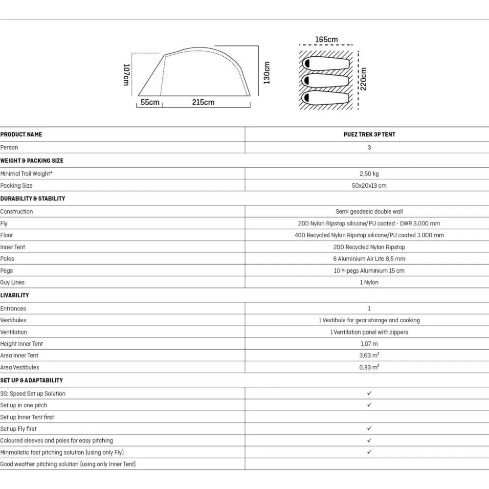 Mit dem Puez Trek Zelt gibt es keinen Grund zur Frustration beim Aufbau. Dank der farbcodierten Hülsen und Zeltstangen ist ein schneller und unkomplizierter Aufbau möglich. Das „3S Speed Set Up“ System mit kurzen, flachen Gestängekanälen und Haken ermöglicht einen effizienten Aufbau in einem Durchgang. Bei guten Wetterbedingungen kann das Außenzelt auch einzeln aufgestellt werden.