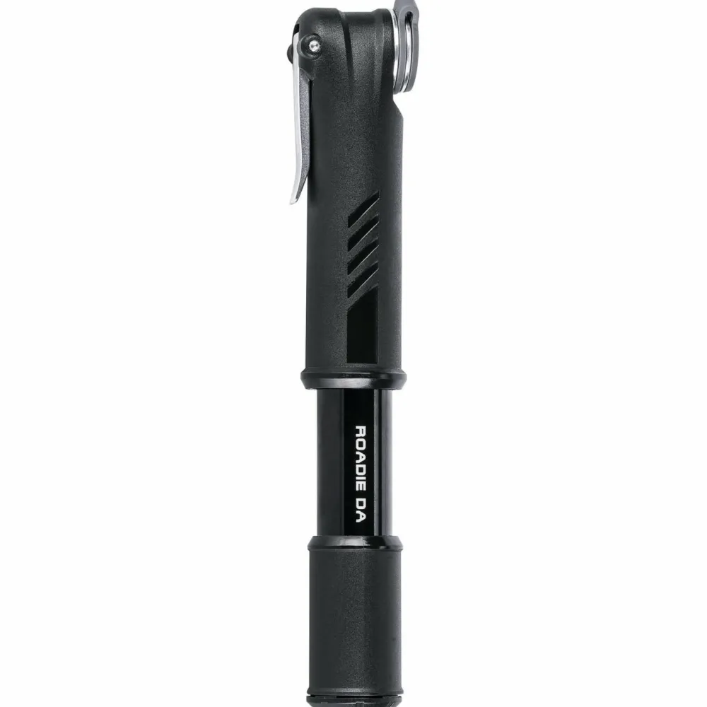 Ein absolutes Leichtgewicht, das ist die Roadie DA Minipumpe von Topeak. Sie verdoppelt das Volumen bei jedem Hub und die Schutzkappe hält ihren Kopf immer sauber. Für eine luftdichte Verbindung sorgt der Daumenhebel. Die Pumpe passt problemlos ins Trikot.