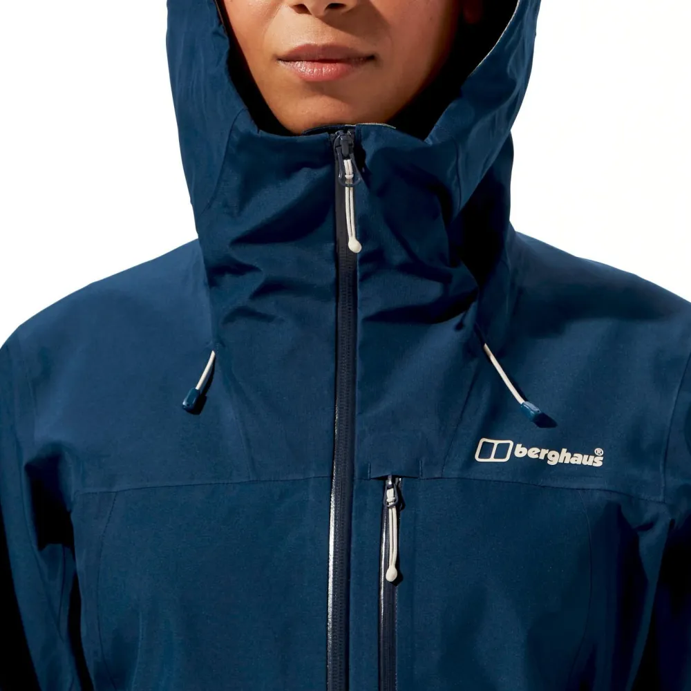 Um Dir die verslustsichere und vor Wasser geschützte Mitnahme wichtiger Kleinigkeiten, die schnell griffbereit sein müssen, zu ermöglichen, haben Berghaus der Women’s Ridge-Seeker GTX zwei Front- und eine Brusttasche mit Reißverschluss spendiert, sowie eine zusätzliche Innentasche angebracht. Und wenn der Wind Orkanstärke erreicht, schützt der hoch schließende Stehkragen den Halsbereich zuverlässig. Die Kapuze schließlich ist zweifach verstell- und damit anpassbar; außerdem kannst Du sie auch gut mit einem Helm tragen, falls Du die Jacke zum Biken, Klettern oder beim Klettersteig gehen tragen möchtest.