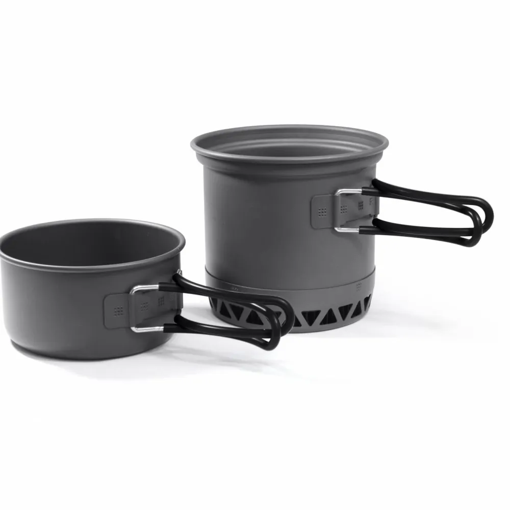 Das Biwak Topfset Radiator von Origin Outdoors ist ein sehr leichtes und kompaktes Set zum Campen! Darin enthalten sind zwei Töpfe in unterschiedlicher Größe. Die gummierten Klappgriffe bieten sicheren Halt beim Kochen. Platzsparend wird alles gestapelt im Netzbeutel verstaut.