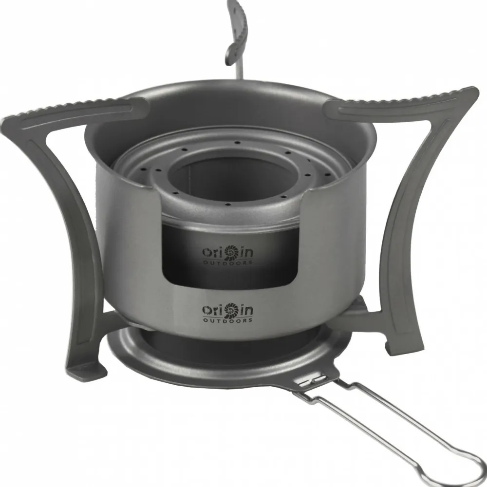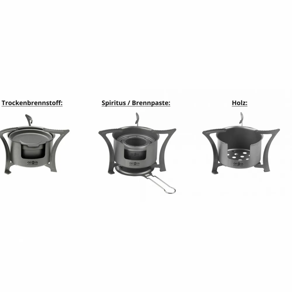 Der Titan Kocher Combo von Origin Outdoors kann mit Spiritus, Brennpaste und mit festen Brennstoffen verwendet werden. Der Deckel kann den Spirituskocher im Handumdrehen ind einen Trockenbrennstoffkocher umfunktionieren. Bei Bedarf kann der Griff des Deckels auch entfernt werden. Robust und vielseitig, ideal zum Campen!